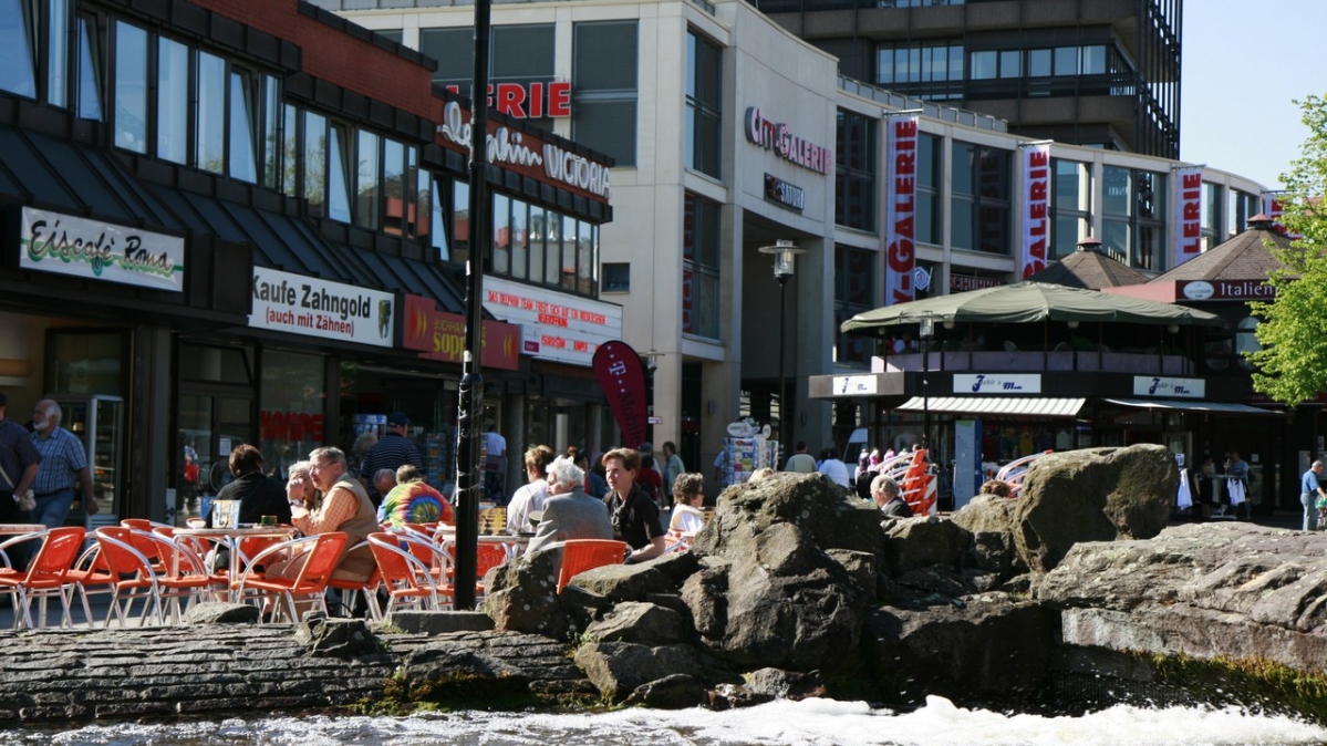 Sonnenbad in der Fußgängerzone Wolfsburg vor der City-Galerie.
