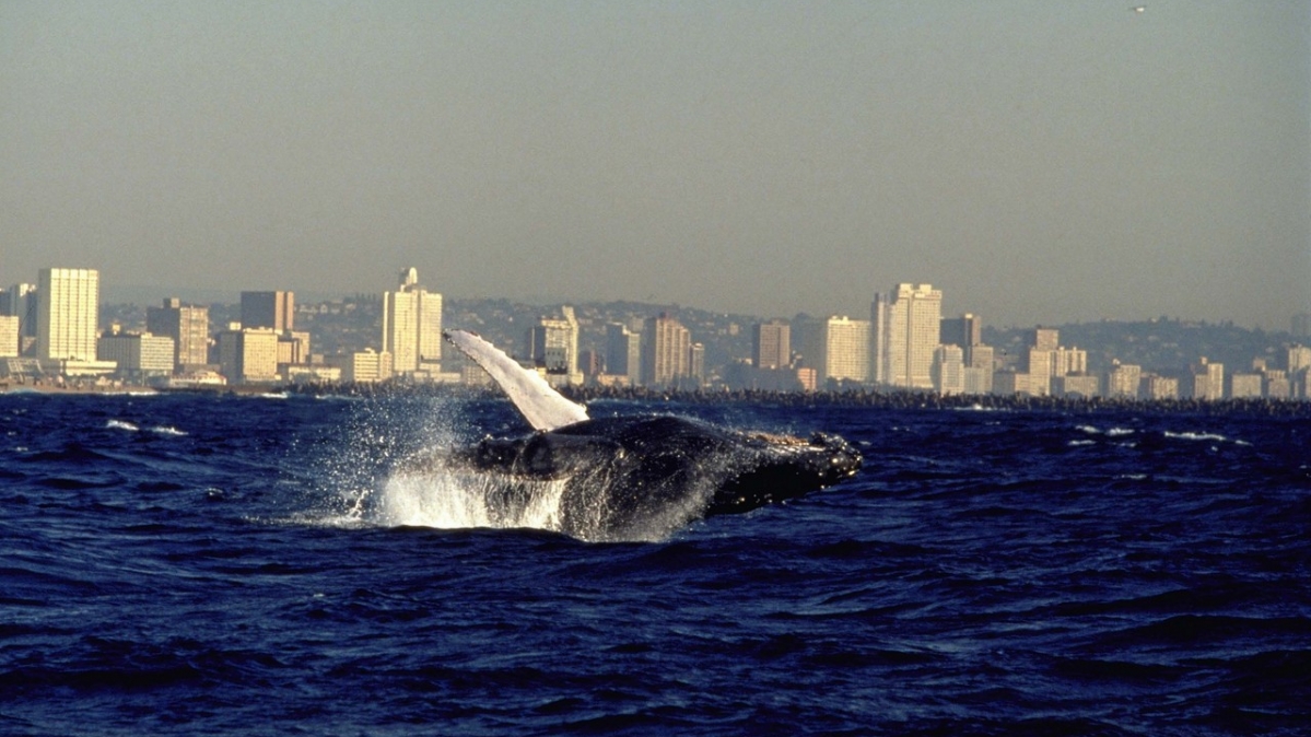 Ein Buckelwal (Megaptera novaeangliae) springt vor der Skyline von Durban aus dem Wasser.