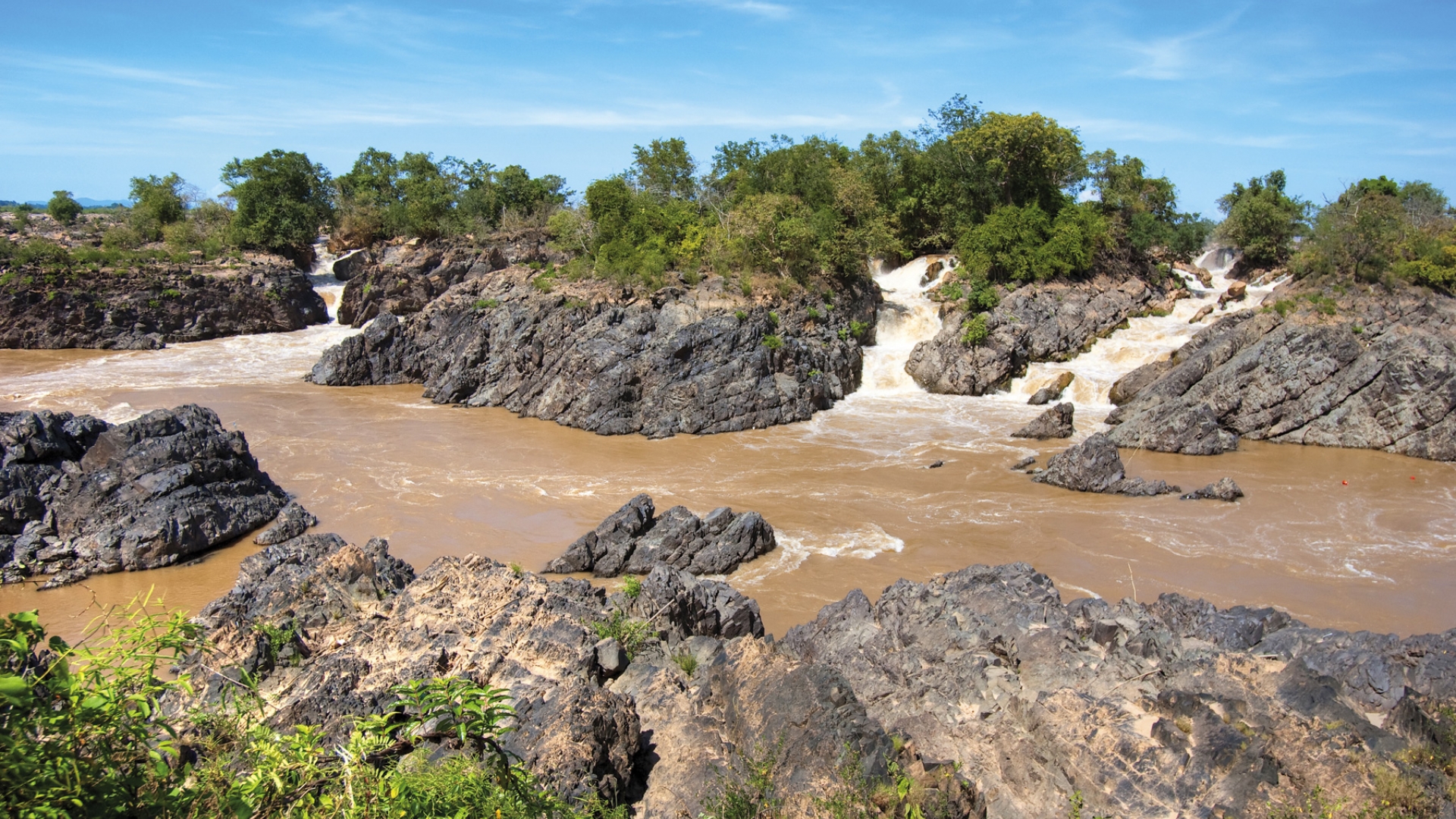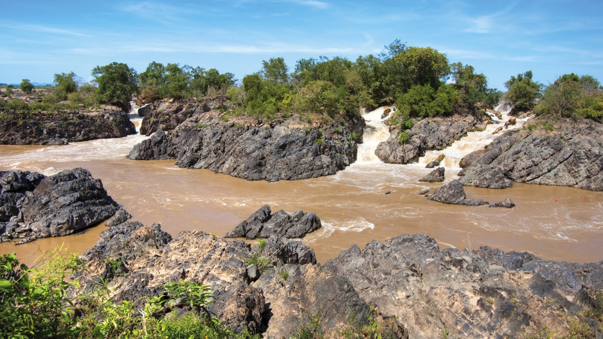Kaskadenartig fallen die Mekongfälle auf einer Breite von 10 Kilometer über 21 Meter. Zusammen ergeben sie den breitesten Wasserfall der Welt. Er befindet sich in der laotischen Provinz Champasak nahe der Grenze zu Kambodscha. In der Monsunzeit überschwemmt der Regen die treppenförmigen Ausformungen und der Mekong River wird zu einem breiten Fluss.