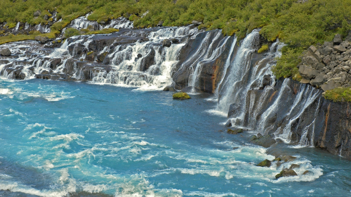 Hraunfossar - der isländische Name verrät, dass diese Wasserfälle direkt aus dem Lavafeld heraus entspringen. Mehr als hundert kleine Wasserfälle und Rinnsale strömen aus dem schwarzen Gestein und laufen über gut 700 Meter. Es handelt sich nicht um Wasserfälle im eigentlichen Sinn. Denn die einzelnen Ströme sind die verlängerten Ärmchen des im Gestein versickernden Flusses Hvíta. Sie treten durch das löchrige Lavafeld wieder zutage.