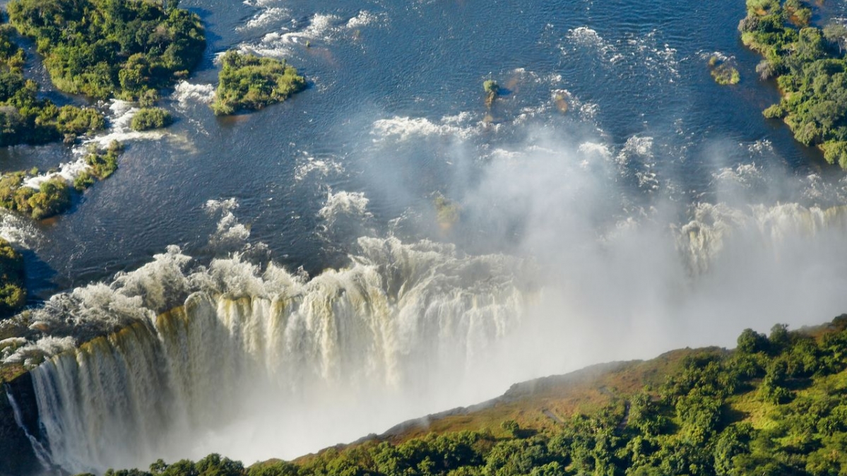 Der Sprühnebel der 120 Meter hohen Victoriafälle an der Grenze zwischen den afrikanischen Staaten Simbabwe und Sambia ist schon aus 30km Entfernung zu sehen, weil er bis zu 300 Meter aufsteigt. Bis heute ist ungeklärt, wie die Victoriafälle entstanden sind. Ein zugrundeliegendes Kluftsystem, das aus weichem Sandstein besteht, verursacht eine stetige Wanderung der Fälle.