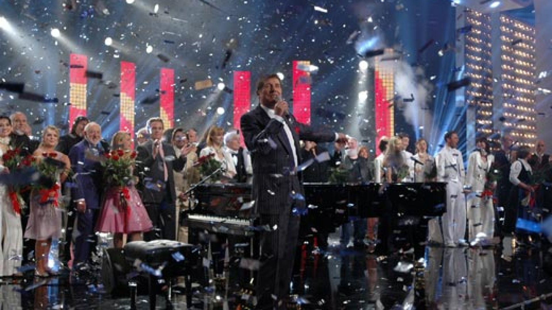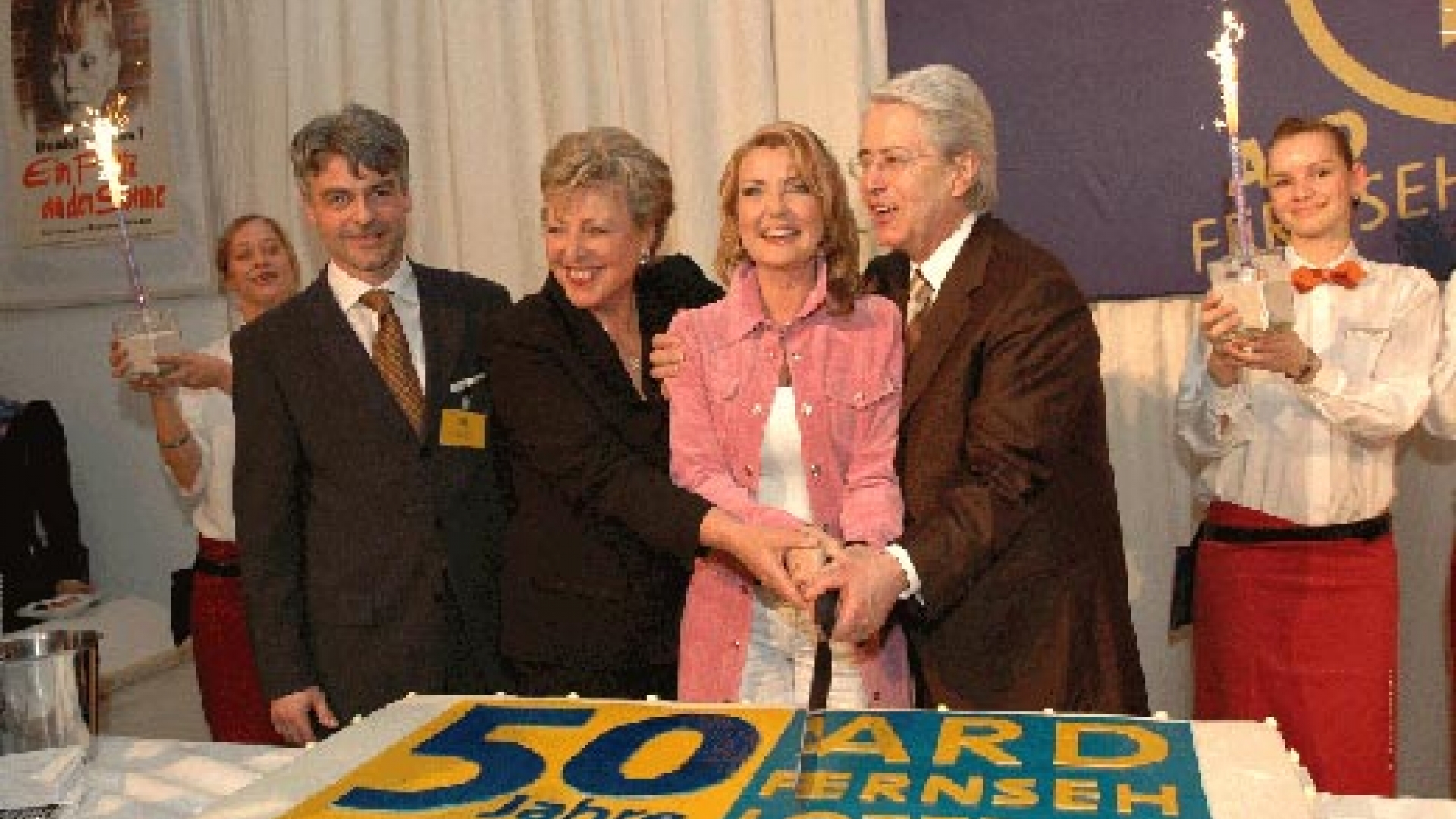 Nach der Show im Hotel "Estrel": Das Anschneiden der großen 50-Jahre-Geburtstagstorte, v.r.n.l. Frank Elstner, Jane Comerford, Marie-Luise Marjan und Christian Kipper, Geschäftsführer der ARD-Fernsehlotterie. Bei der Party im "Estrel" vergnügten sich über 600 geladene Promis und Gäste der ARD-Fernsehlotterie.