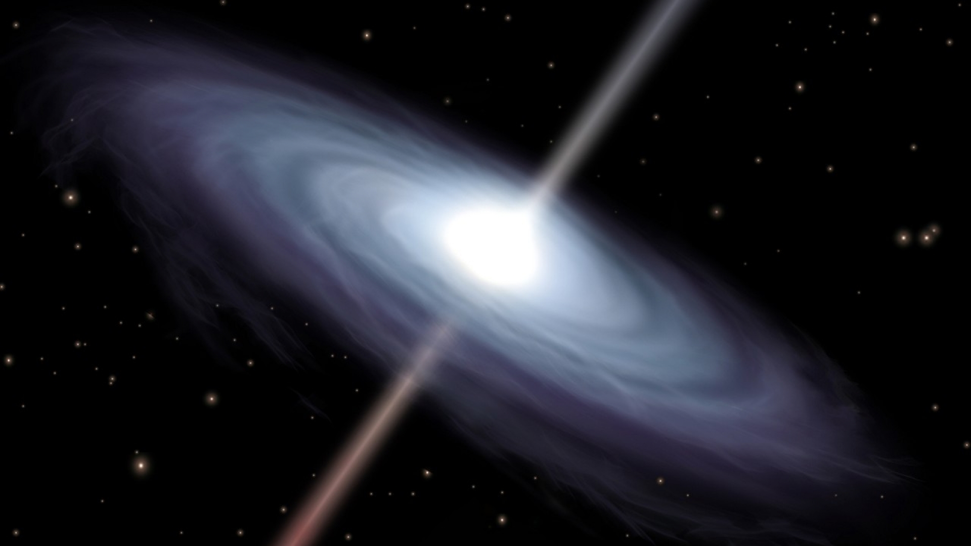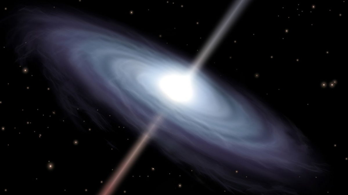 Illustration eines "mittelgroßen" schwarzen Loches, wie sie im Herzen von Spiralgalaxien im gesamten Universum existieren. Ein schwarzes Loch ist im Weltall ein Objekt, das eine so starke Schwerkraft hat, dass nicht nur materielle Teilchen, sondern auch sämtliche elektromagnetische Strahlen das Gebilde nicht verlassen können. Schwarze Löcher geben kein Licht ab. Sichtbar von der Erde ist nur die Materie, die in das Schwarze Loch hineinwirbelt. Ein mittelgroßes Schwarzes Loch ist 100 bis 10.000 mal so massiv wie die Sonne, besetzt dabei aber nur einen winzigen Bruchteil ihres Raumes.