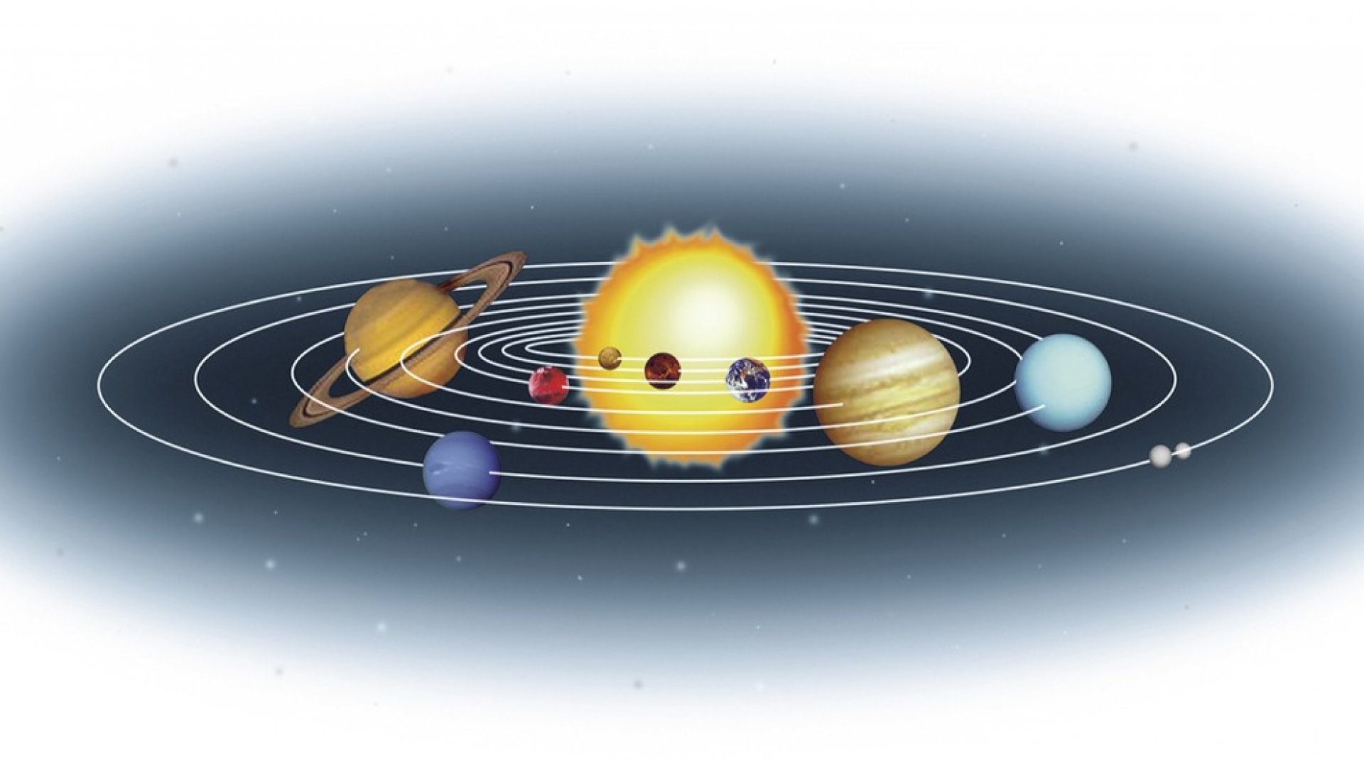Die Sonne umrunden von innen nach außen die Planeten Merkur, Venus, Erde, Mars, Jupiter, Saturn, Uranus und Neptun. Wegen seiner geringen Größe gilt Pluto seit 2006 nicht mehr als Planet. Die hier gezeigten Größenverhältnisse entsprechen nicht der Wirklichkeit. Für eine korrekte Darstellung der Maßstäbe wäre die Sonne viel zu groß, um überhaupt ins Bild zu passen ...
