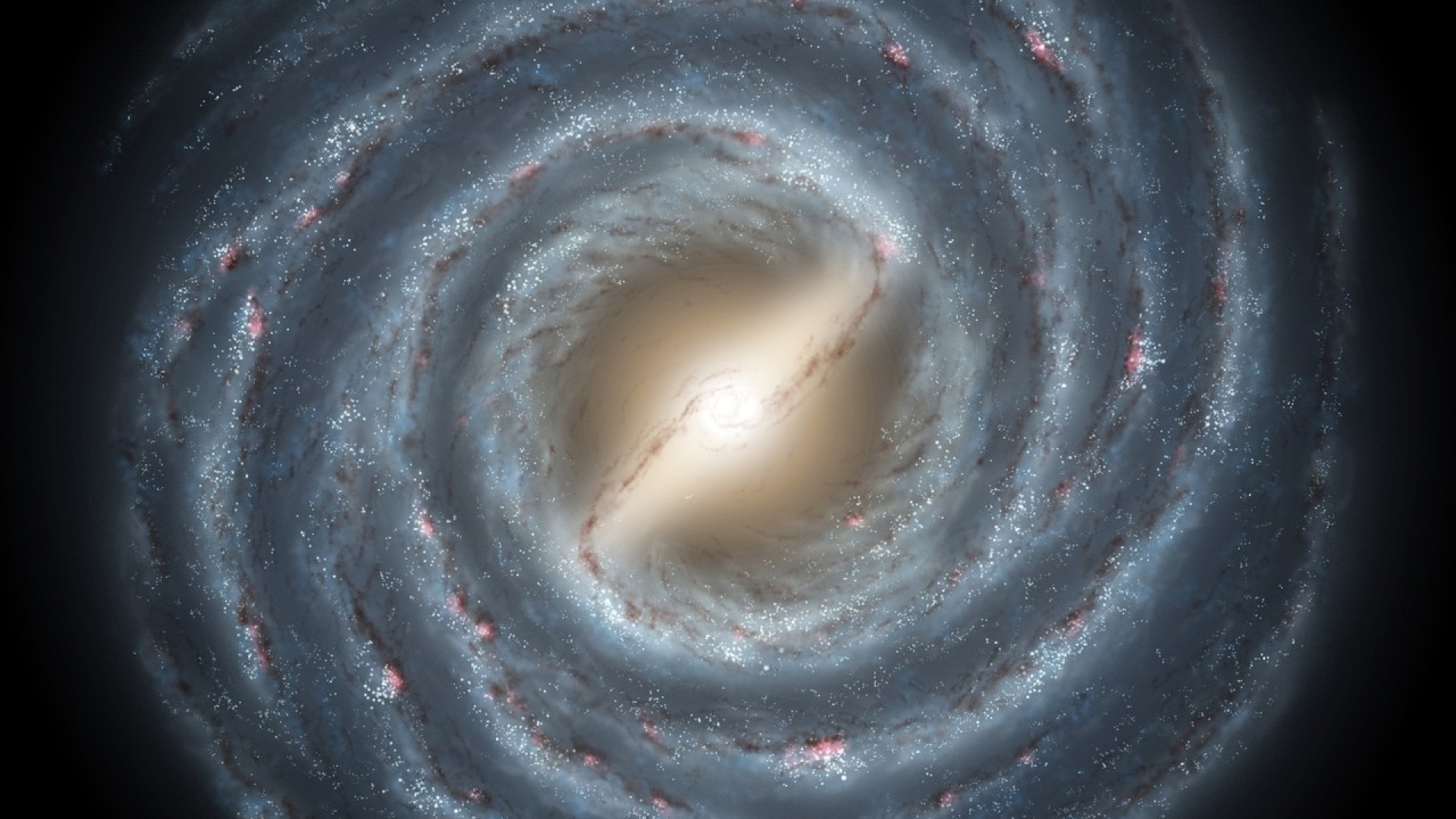 So könnte die Milchstraße für einen Betrachter von außerhalb aussehen: von oben wie eine Spirale und von der Seite wie eine flache Scheibe. In einer klaren Nacht sehen wir von der Erde aus mit bloßem Auge nur etwa 3000 Sterne. Aber über den Himmel erstreckt sich ein feines nebliges Band, die Milchstraße. Sie stellt die Innenansicht unseres eigenen Sternensystems dar, eine riesige Spirale aus Gas und über 100 Milliarden Sternen. Einer davon ist die Sonne. Unser Sonnensystem ist also nur ein winziges Teilchen der Milchstraße, ganz zu schweigen vom Staubkörnchen Erde ... Die Mitte unserer Milchstraße bildet ein riesiger rundlicher Kern, vollgepackt mit Sternen. Wir sind 27 000 Lichtjahre von der Mitte dieser 100 000 Lichtjahre großen Galaxie entfernt.