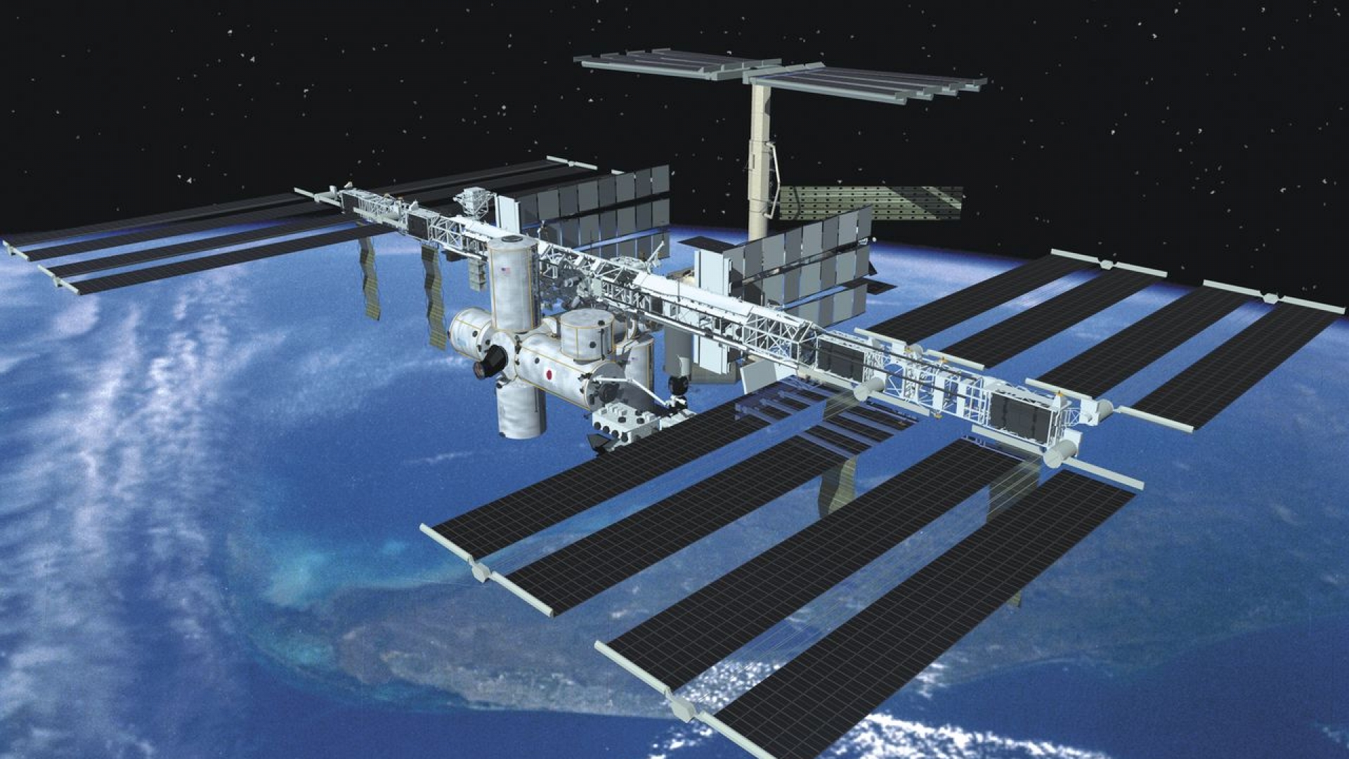 Modell der Internationalen Raumstation (ISS); sie wird von 16 Ländern finanziert. Die ersten Teile wurden 1998 installiert. Der Aufbau der Station soll bis 2010 abgeschlossen sein. Die 1200 Quadratmeter große und 426 t schwere Station bewegt sich auf einer Umlaufbahn in 350-450 km Höhe um die Erde. Die ISS soll verschiedenen Forschungszwecken dienen, u. a. als Plattform für die künftige Nutzbarmachung des Weltraums und einer bemannten Marslandung. Anfang November 2000 gingen drei Astronauten als erste ständige Besatzung der ISS an Bord.