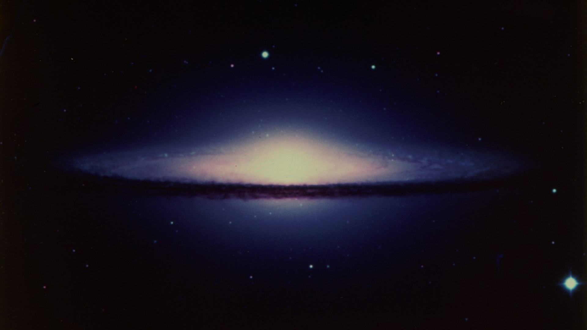 Ungefähr 30 Millionen Lichtjahre entfernt sehen wir hier die "Sombrero-Galaxie" mit Milliarden Sonnen und Sternen. Diese Galaxie wurde wurde nach dem gleichnamigen mexikanischen Hut benannt, da sie von der Seite aus so ähnlich aussieht. Als Galaxien bezeichnet man die selbstständigen Sternsysteme des Weltalls. Der durchschnittliche Abstand zwischen zwei Galaxien beträgt etwa 100 000 bis einige Millionen Lichtjahre. Die von aus aus nächste Galaxie ist der Andromedanebel in 2,6 Millionen Lichtjahren Entfernung. Die Gesamtzahl aller Galaxien in dem Teil des Weltalls, das wir beobachten können, wird auf rund 100 Milliarden geschätzt.