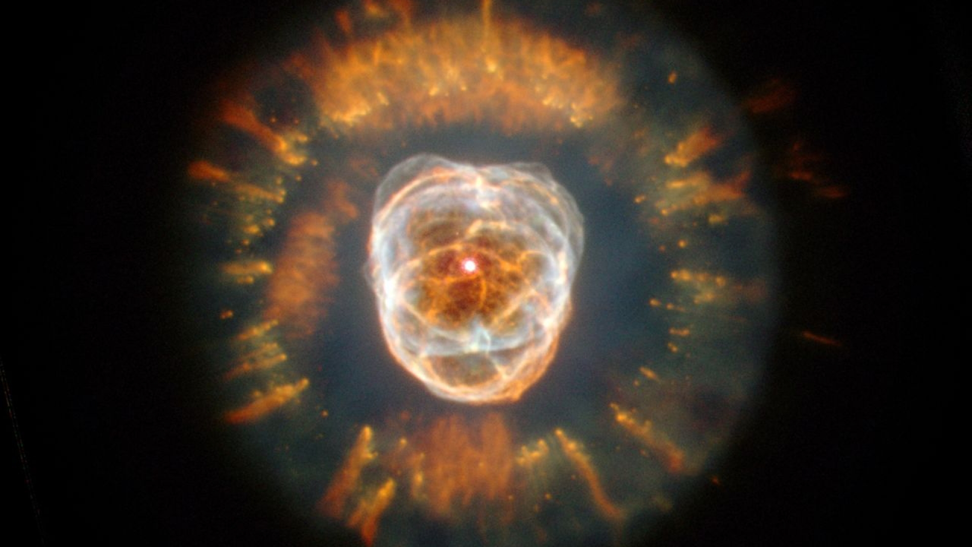 Dieses vom Hubble-Weltraumteleskop im Dezember 1999 aufgenommene Foto zeigt die glühenden Überreste eines sterbenden Sterns, der den Spitznamen Eskimo-Nebel erhielt. Durch eine Teleskop von der Erde aus betrachtet erschien der Nebel den Betrachtern wie ein Gesicht, umrahmt von einer Kapuze aus Fell. Der Eskimo-Nebel (NGC 2392) ist ca. 5000 Lichtjahre von der Erde entfernt.