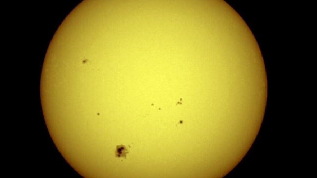 Die Sonne am 7. Juni 1992. Der Sonnenfleck links unten hat etwa die fünffache Erdgröße. Die Lebensdauer von Sonnenflecken reicht von wenigen Tagen bis zu mehreren Monaten.