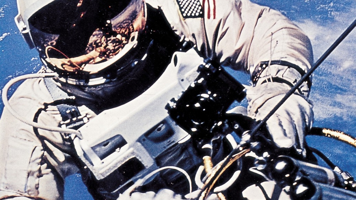 Der Astronaut Edward H. White bei seinem Ausstiegsmanöver aus Gemini 4 im Juni 1965. Den ersten Ausflug in den Weltraum außerhalb des schützenden Raumschiffes hatte im März 1965 der Russe Alexei Archipowitsch Leonow unternommen. Solche Ausflüge dienen wissenschaftlichen Forschungen oder Arbeiten am Raumschiff. Sie sind für die Astronauten äußerst anstrengend und gefährlich.