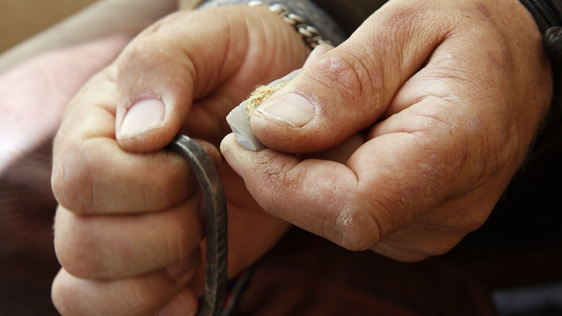 "Meine Güte, ich schaff' es wirklich nicht!", resigniert Sigrid nach ihren zahlreichen Fehlversuchen mit einem Blick auf den von ihr ziemlich abgeschlagenen Feuerstein (und ihre Finger). Auf den richtigen Winkel zwischen Schlagwerkzeug und Stein kommt es an, damit Funken entstehen, die dann "eingefangen" werden müssen, wie Sven fachmännisch erklärt. Bei ihm sieht das ganz einfach aus. Wozu wir das Feuer brauchen?