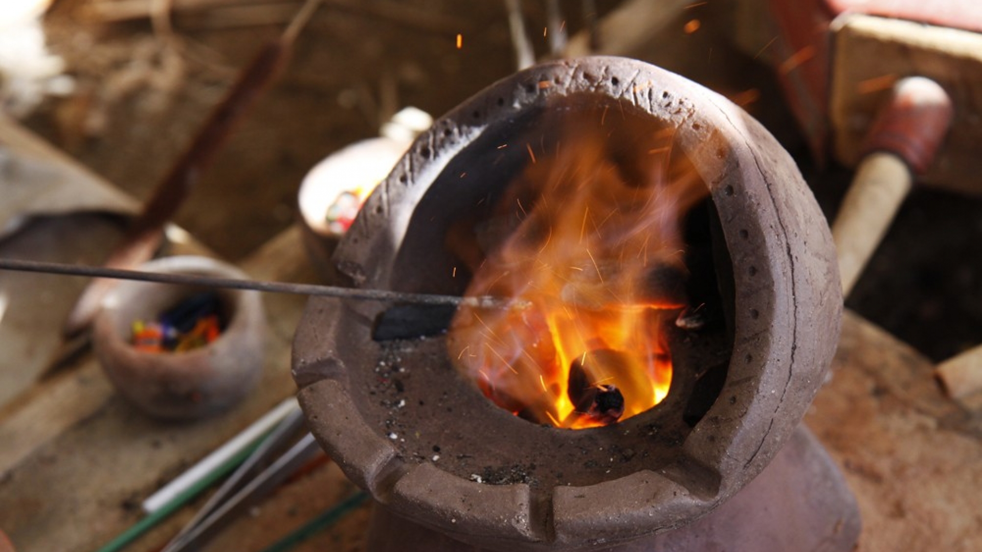 Um Glasperlen herzustellen! Sigrid nimmt am doppelten Blasebalg Platz und versucht, die entstandene Flamme gleichmäßig mit Sauerstoff zu versorgen, damit die für das Glasschmelzen benötigte Temperatur nicht nur erreicht, sondern auch konstant bleiben kann. Hier ist vor allem eines gefragt: Koordination!