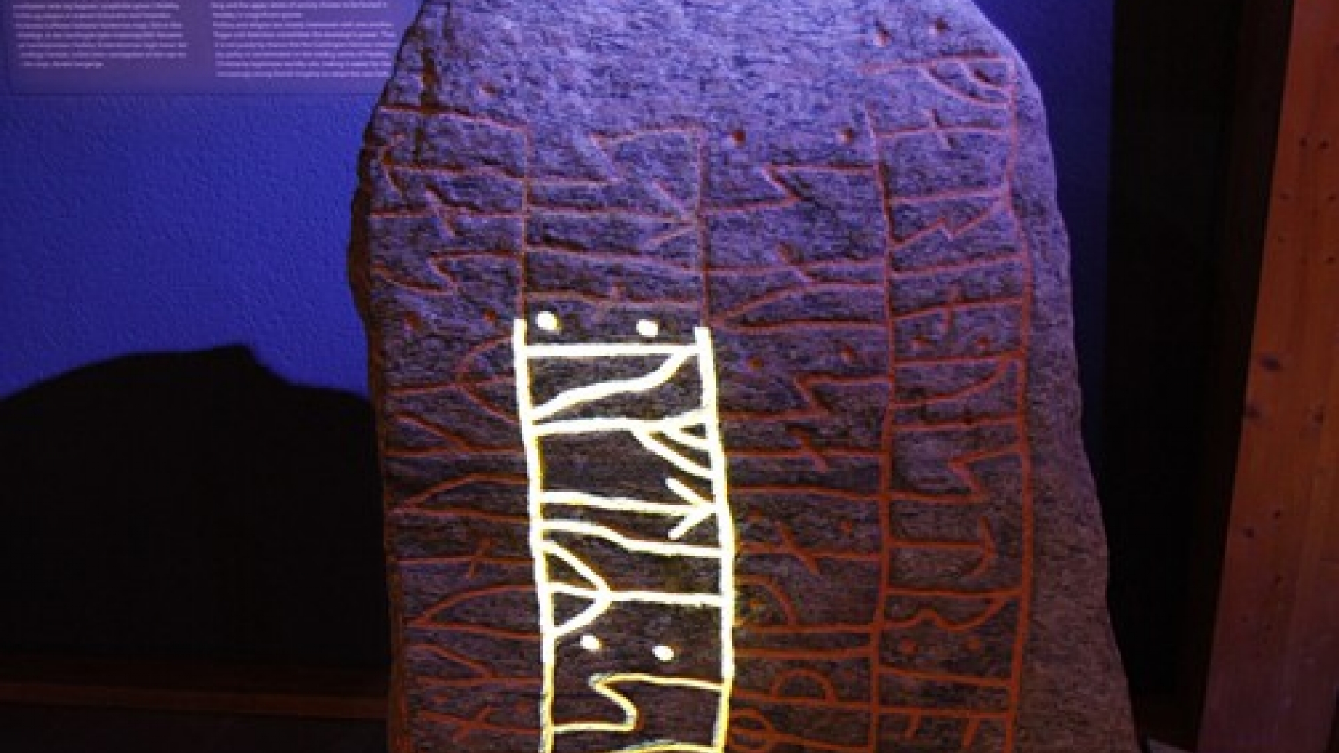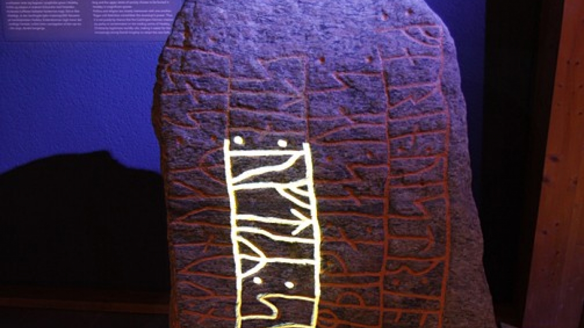 Im Raum "Schauplatz der Macht" schreckt Sigrid kurz zurück. Der Runenstein spricht! Doch Eva Rönnau klärt uns auf - über eine Lichtschranke wird eine Projektion gestartet. Eine Stimme liest den Text auf dem Runenstein vor und gleichzeitig wird der gelesene Teil auf dem Stein belichtet, mit eingeblendeter Übersetzung auf dem Boden in Deutsch, Dänisch und Englisch! Mehr als 5500 dieser zum Gedenken an gefallene Krieger errichteten Steine hat man im skandinavischen Raum gefunden. Eine weitere Weisheit aus Eva Rönnaus wissendem Mund nehmen wir im letzten Raum, der Schiffshalle, erstaunt zur Kenntnis, da sie unser beider Wikinger-Wissen erschüttert: Wikingerhelme hatten KEINE Hörner! Mit dem Ausstellungskatalog als Extra-Geschenk verlässt Sigrid das Haithabu Museum.