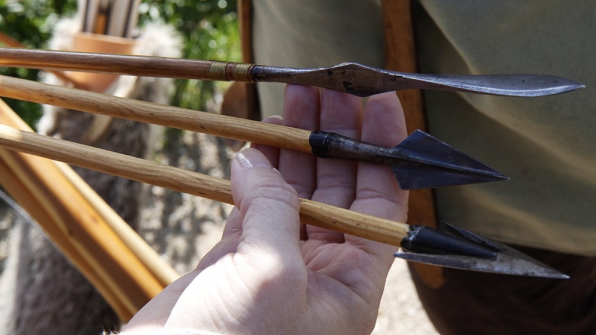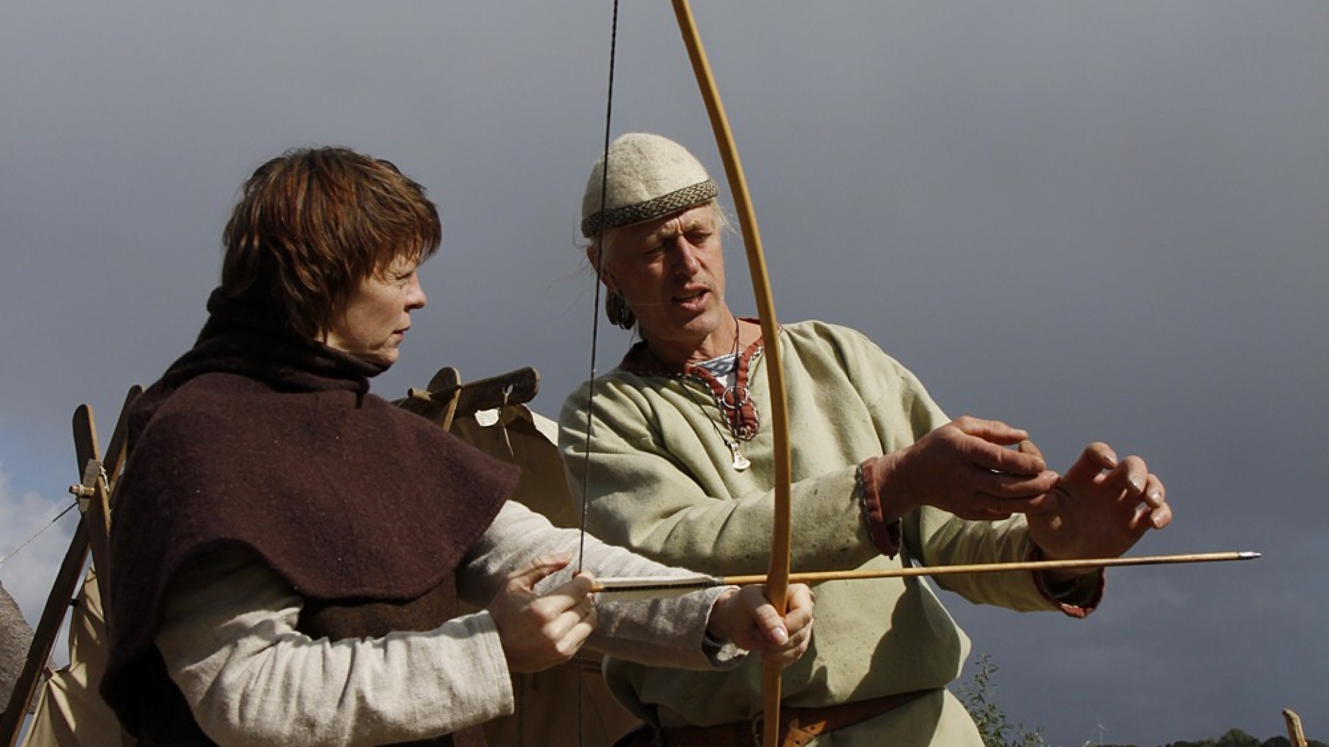 Es wird handfest - auch für Sigrid Eichler, die nun einen selbstgeschnitzten Bogen in die Hand gedrückt bekommt. Reinhard Erichsen leitet die Schießstunde mit einer kleinen Anekdote ein. Vor kurzem habe sich Bundespräsident Wulff in Haithabu in seine Obhut begeben und mehrere Pfeile abgeschossen. Seitdem hört Erichsen auf einen neuen Spitznamen: "Der mit dem Wulff schießt". Viel wichtiger ist es dem Berufswikinger allerdings, Sigrid etwas über das "instinktive Schießen" zu vermitteln. "Man muss die Flugbahn verinnerlichen - und natürlich die Energie des Bogens". Dass er das getan hat, merken wir an seinem Probeschuss, bei dem er einen Pfeil auf ca. 130 m Entfernung ins benachbarte Feld jagt. Sigrids Blick geht zögerlich nach links, wo ein etwa siebenjähriger Junge in Seelenruhe seine Pfeile zielsicher versenkt. "Das kann ich nie!", prophezeit sie.