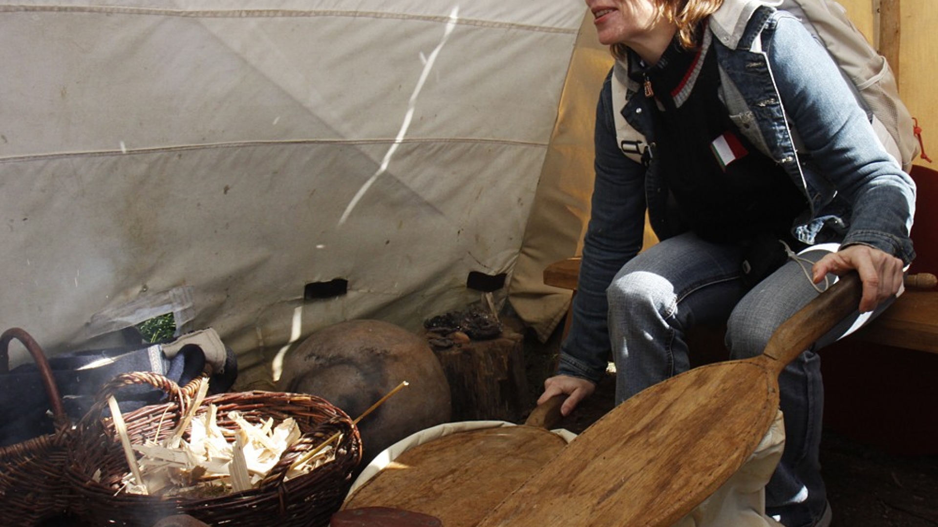 Aber Reinhard Erichsen ist nicht nur Bogen- und Bootsbauer, auch seine Brote im Lehmofen sind in Haithabu eine allseits geschätzte Delikatesse. "Dabei probieren wir immer wieder neue Dinge aus", sagt Erichsen. Als der Ofen die richtige Temperatur erreicht hat, wird die heiße Asche mit Zweigen ausgefegt und das Sauerteigbrot hineingeschoben. "In etwa einer Stunde ist es fertig".