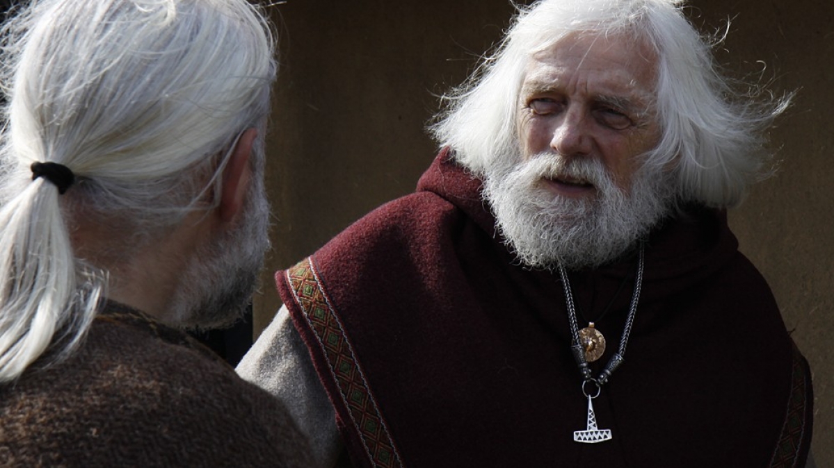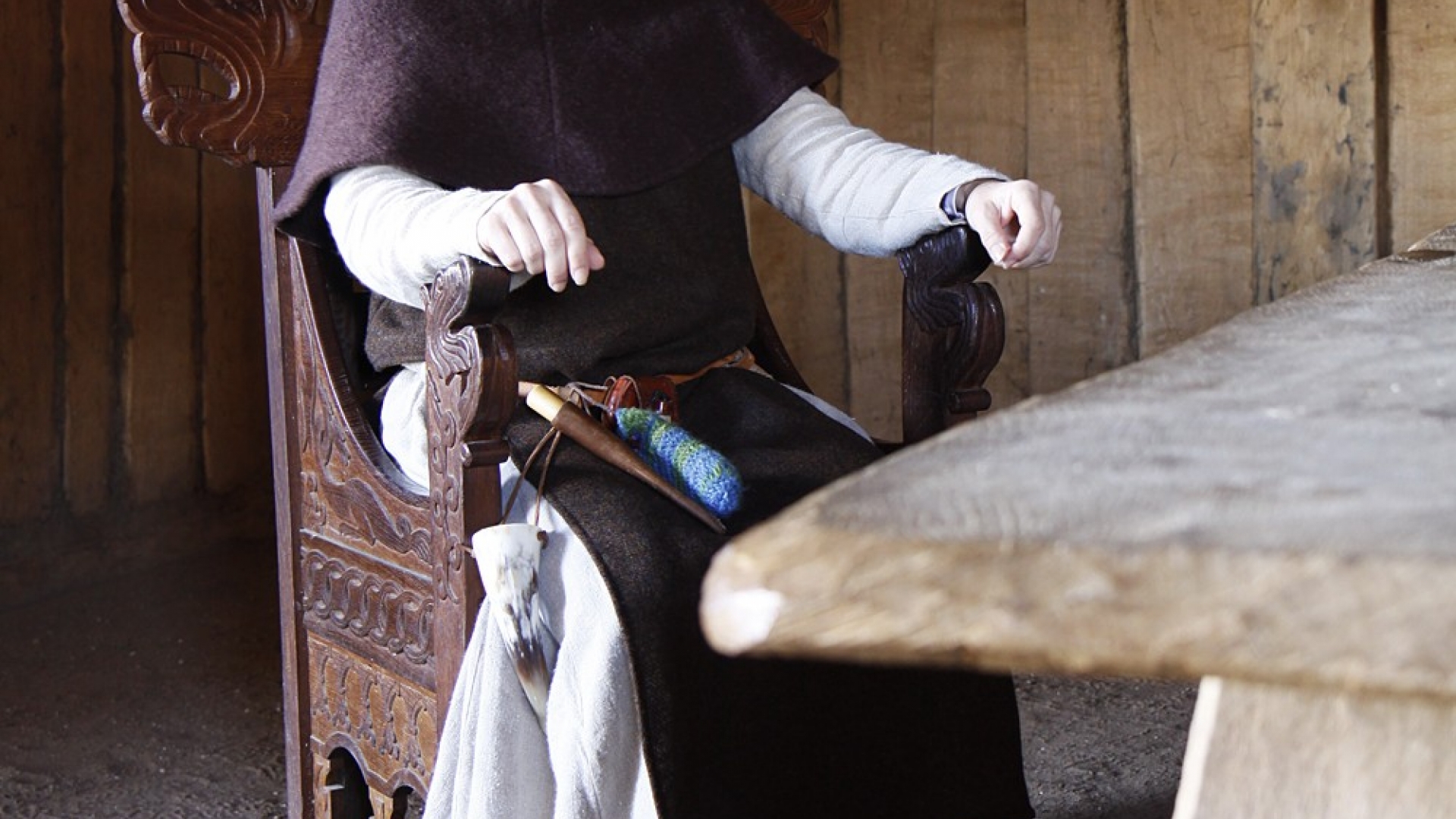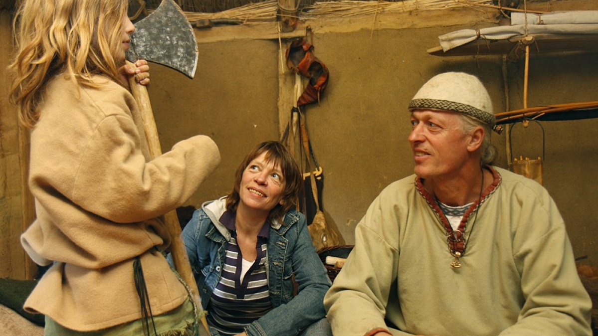Handys? Fehlanzeige. Fernseher oder Radio? Gibt es hier nicht. Strom? Wozu denn? Stattdessen laufen hier merkwürdig gewandete Menschen mit Helmen oder Filzhüten auf dem Kopf und weichen Lederschuhen an den Füßen zwischen den Häusern herum. Ausgerüstet mit Gürteln, an denen Dolch, Trinkhorn und Ledertäschchen baumeln. Manche halten Äxte, Schilde und Speere in der Hand. Schottische Hochlandrinder grasen auf den Wiesen. Wir sehen reetgedeckte Häuser, aus denen Rauch quillt. Die Zeit scheint stehengeblieben. Und dann kommt er, Reinhard Erichsen. Hauptberuflich angestellter Wikinger! Fester Blick und starker Händedruck. Er wird uns in den nächsten Stunden fachkundig begleiten und die Grundkenntnisse des Wikingeralltags vermitteln. Schnell kommen wir ins Plaudern und Sigrid fühlt sich angekommen.
