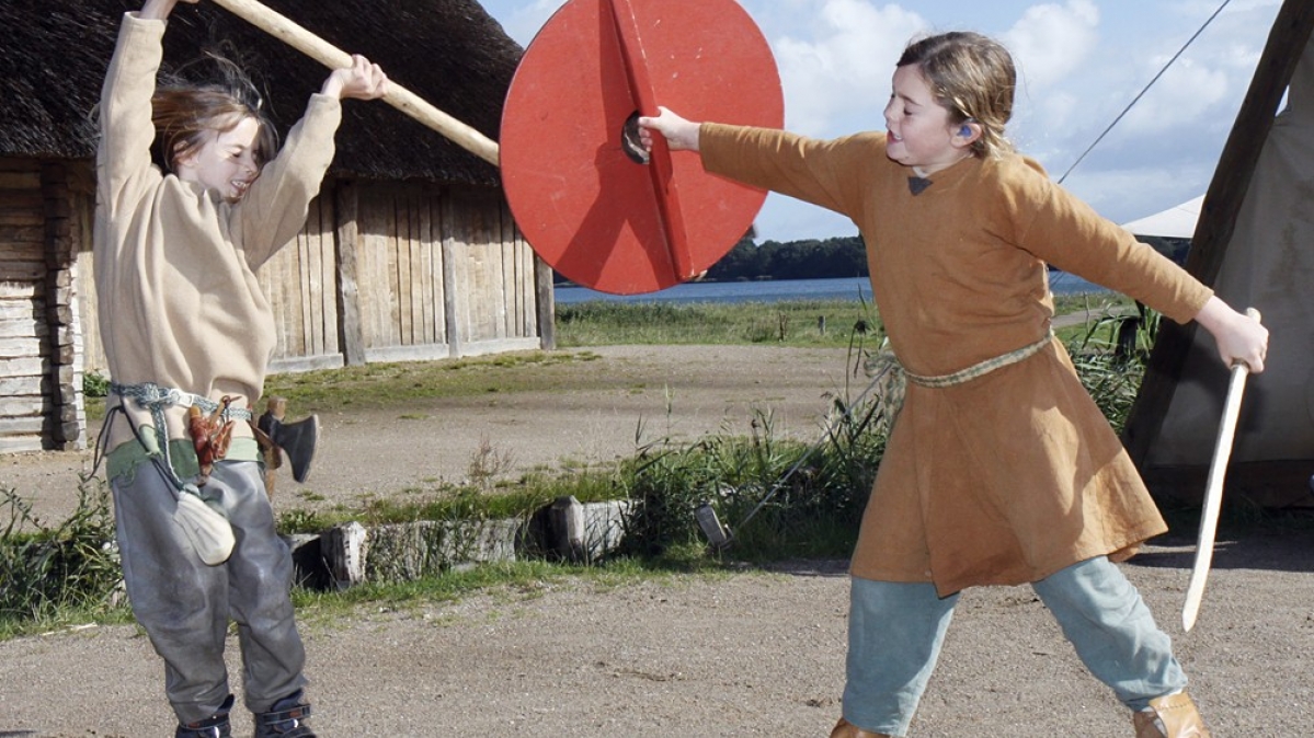 Reinhard Erichsen führt uns erst einmal durch die kleine Siedlung am Noor und erzählt, dass an diesem Wochenende die Mitglieder des Wikinger-Vereins "Opinn Skjold e.V." (Offener Schild) in den Wikinger-Häusern leben und arbeiten. Und wir spüren schnell, dass das keine "Freaks" sind oder Menschen, die einfach dem Alltag entfliehen wollen. Nein, hier leben sie nicht wie Wikinger, sondern als Wikinger. Plötzlich Kampfeslärm vom Wasser! Zwei Jungs kämpfen mit Schwert, Axt und Schild (natürlich aus Holz!). Und tun das so geschickt, dass kein Erwachsener auch nur auf die Idee käme, hier einzugreifen.