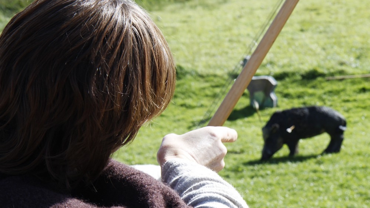 Jetzt muss Sigrid ran. Nach den ersten mutlosen Versuchen zieht sie die Sehne aus gewachster Leinfaser kraftvoll zurück, visiert an - und trifft den Keiler aus Plastik mit einem satten Blattschuss, der in etwa 10 m Entfernung nichtsahnend auf der Wiese grast. "So, der wäre jetzt tot", bemerkt Reinhard Erichsen knochentrocken. Sigrid grinst.