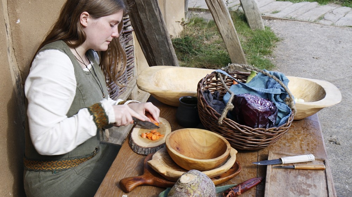 Beim Kochen mischt sich Erichsen dann diesmal nicht ein. Zumindest nicht für das Abendessen, denn hier wird von den Frauen und jungen Mädchen eifrig Gemüse geschnippelt. Aber eben nicht mit einem Sparschäler aus dem Supermarkt, sondern mit selbst geschmiedeten Klingen. Und die Handgriffe mit den Wikingermessern wollen gelernt sein. Aber um diese Aufgabe kommt Sigrid herum.