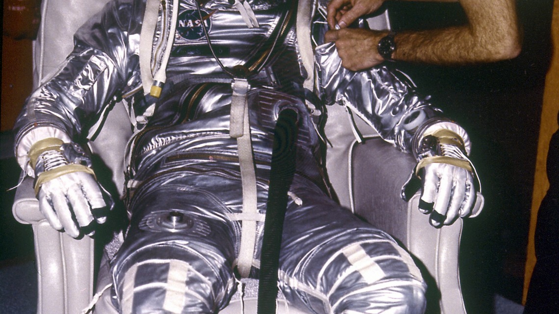 Astronaut Alan B. Shepard Jr. wird am 5. Mai 1961 für den ersten bemannten Flug auf MR-3 vorbereitet.