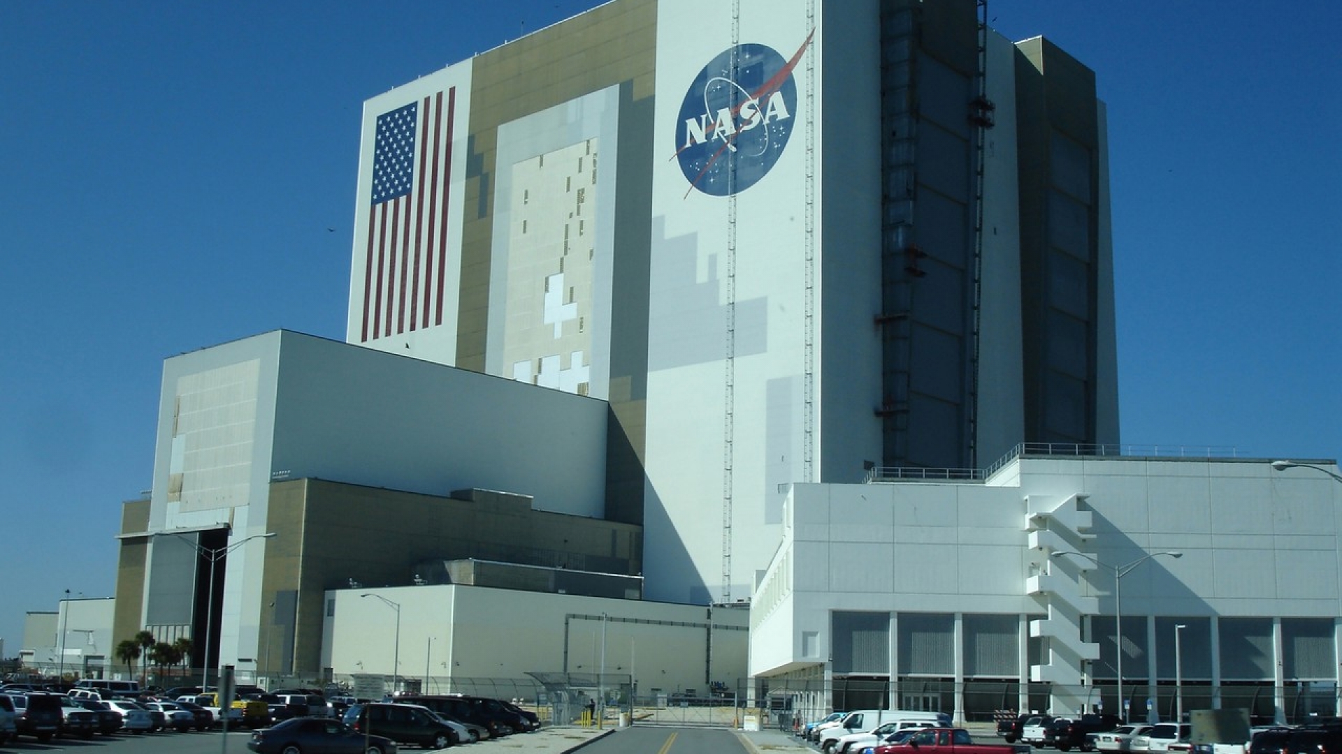 Das "Vehicle Assembly Building" (VAB), auf dem John-F.-Kennedy-Raumfahrtzentrum ist der Weltraumbahnhof der NASA auf Merritt Island in Florida. Links erkennt man die Low Bay Area und rechts die Seite des Startkontrollzentrums. Das Vehicle Assembly Building ist die riesige Montagehalle, in der der Space Shuttle mit dem Außentank und den Feststoffraketen verbunden und für den Start vorbereitet wird. Es ist das Wahrzeichen des Kennedy Space Centers.