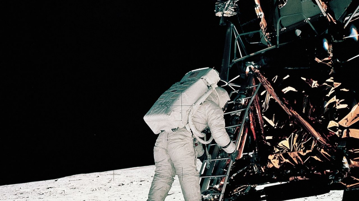Edwin Aldrin, einer der Apollo-11-Astronauten, verlässt die Mondfähre und betritt den Erdtrabanten. Fotografiert von Neil Armstrong, der zuvor als erster Mensch den Mond betreten hatte.