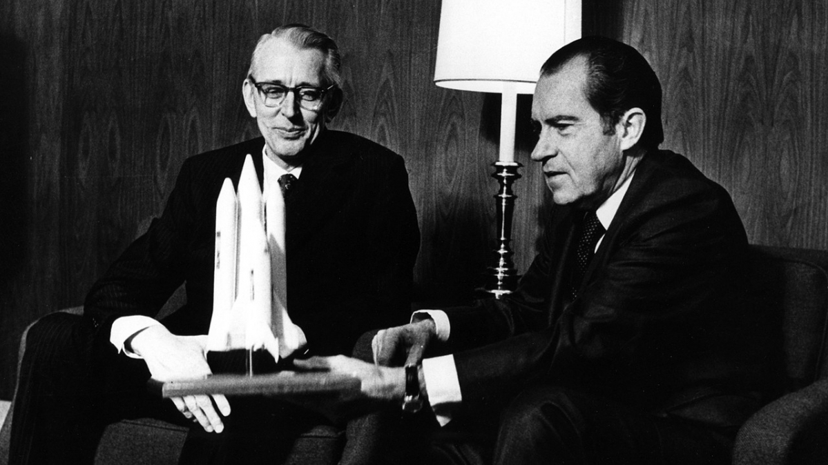 Präsident Richard Nixon vor einem Model des Space Shuttle.
