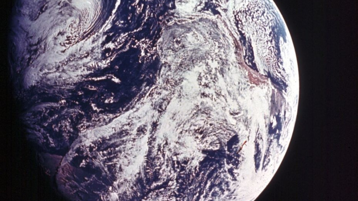 Aufnahme der Erde von Apollo 8 aus. Erkennbar ist fast die gesamte westliche Hemisphäre von der Mündung des St. Lorenzstromes einschliesslich Neufundland bis zur Tierra del Fuego an der Südspitze Südamerikas; oben rechts: ein kleiner Teil Afrikas.