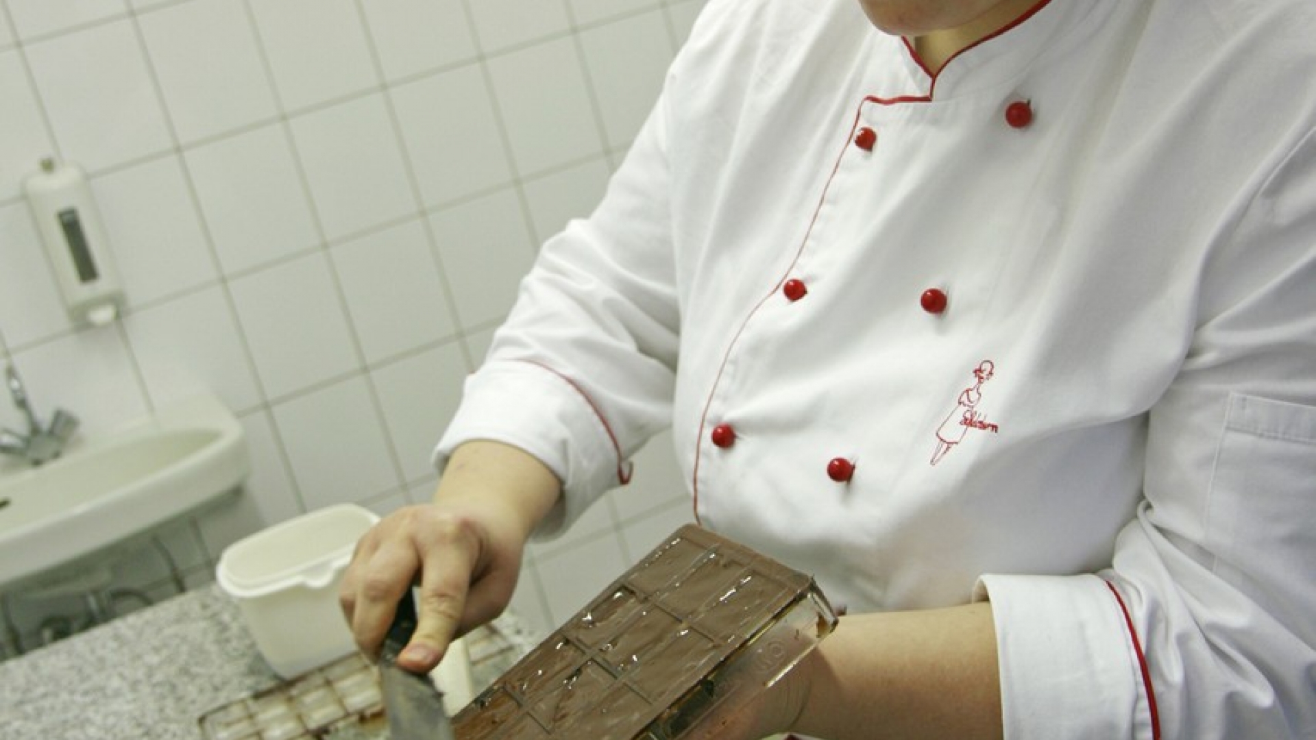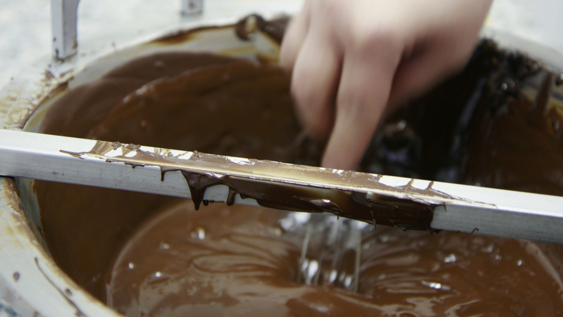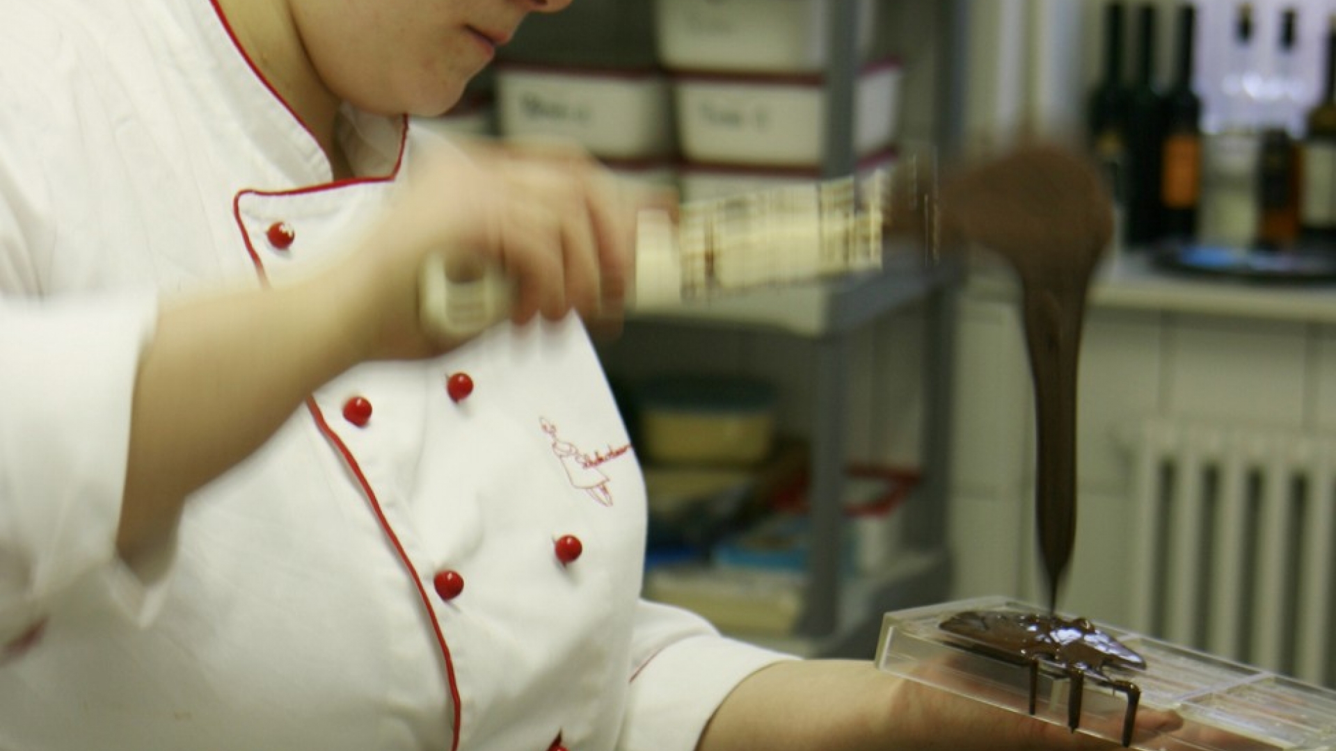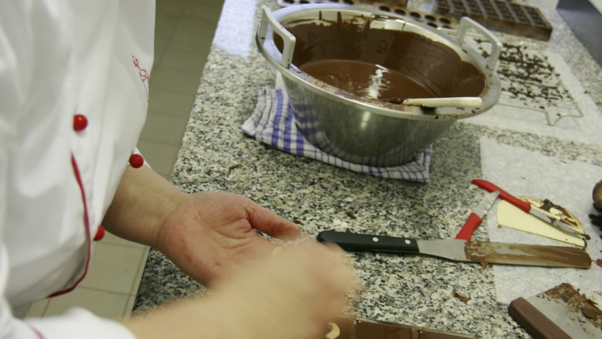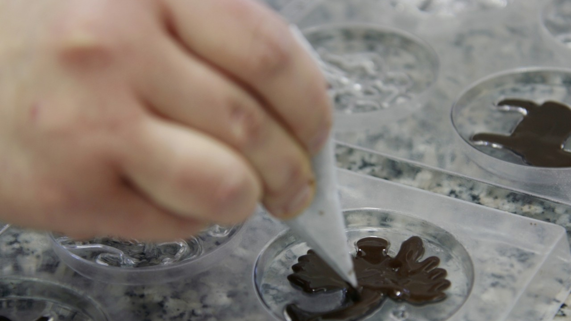 Mit einem breiten Messer streicht Rahaus die temperierte Kuvertüre in die Kartentäfelchen-Form.