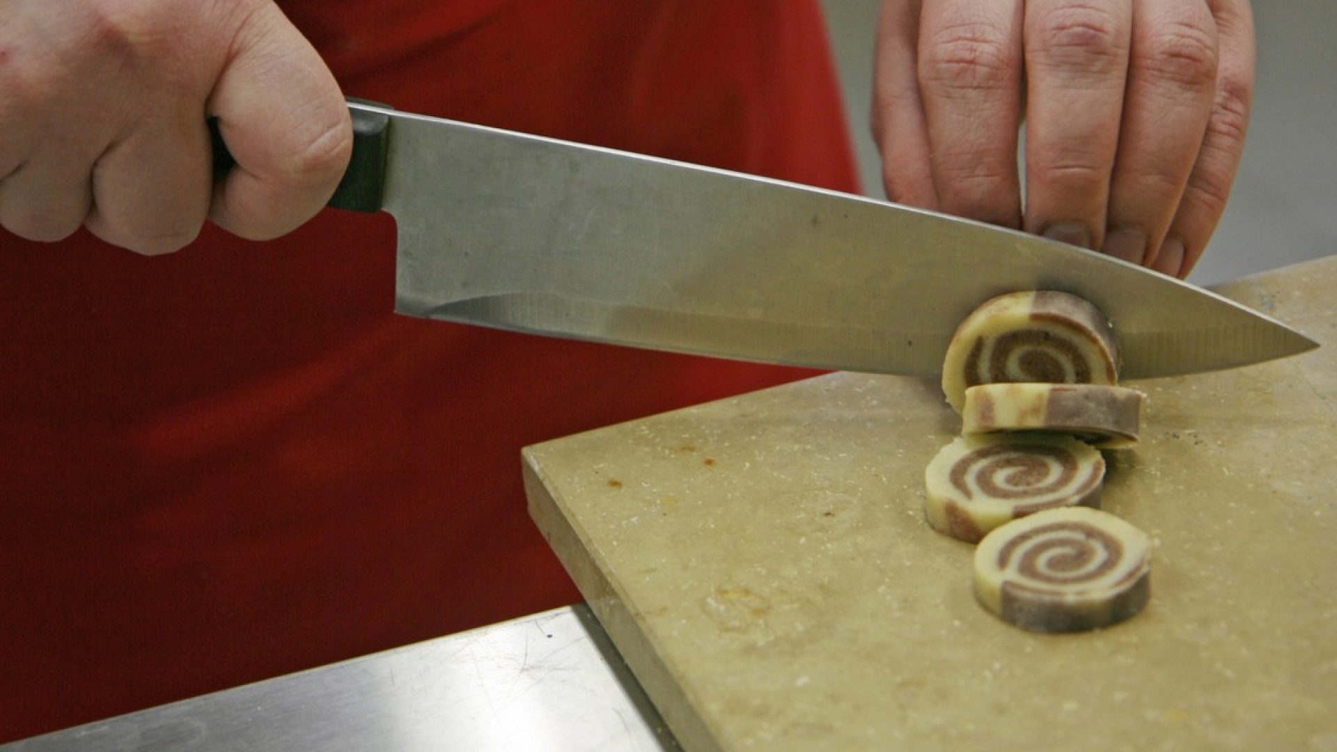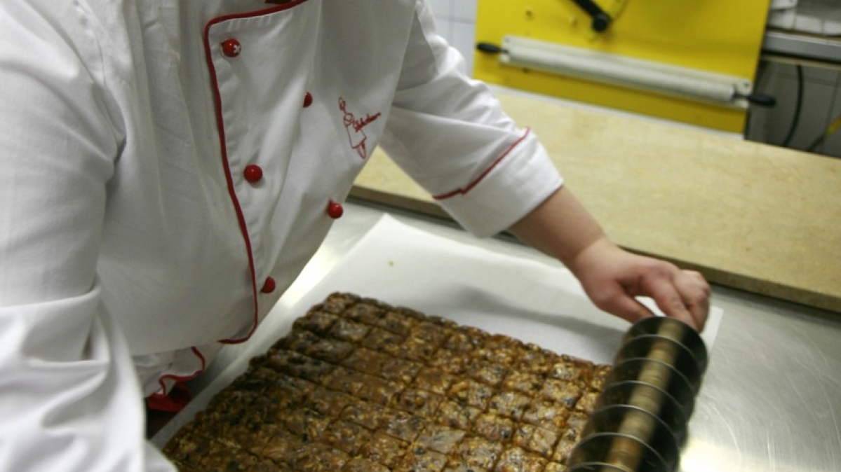 Mit einer Bonbonwalze schneidet Rahaus eine kompakte Nuss-Karamel-Masse.