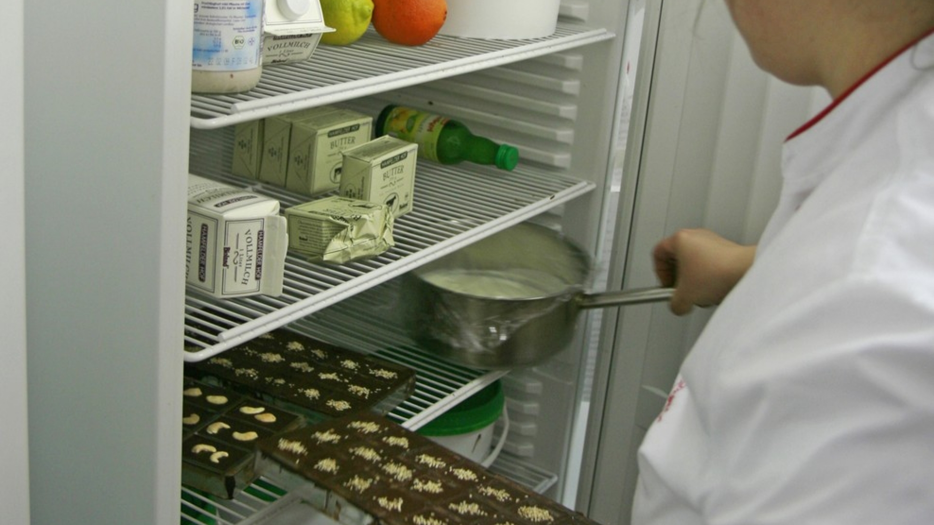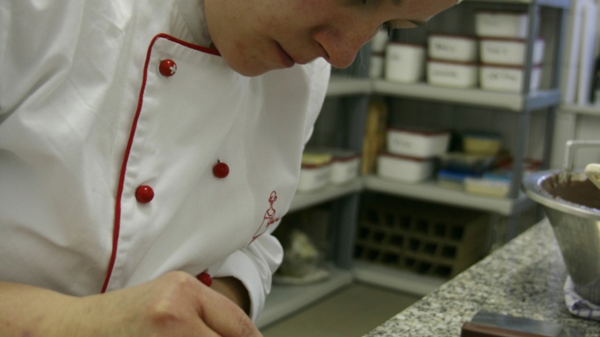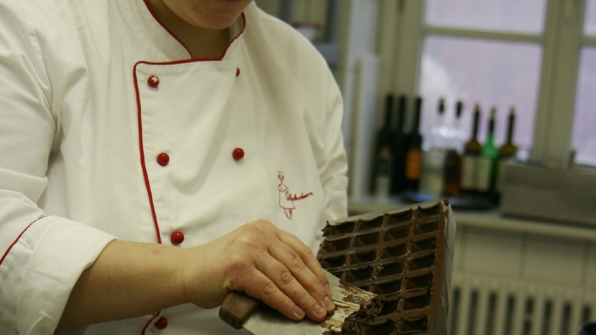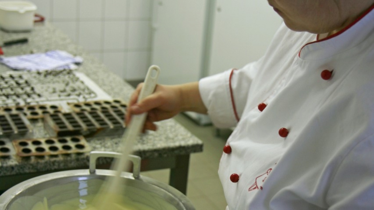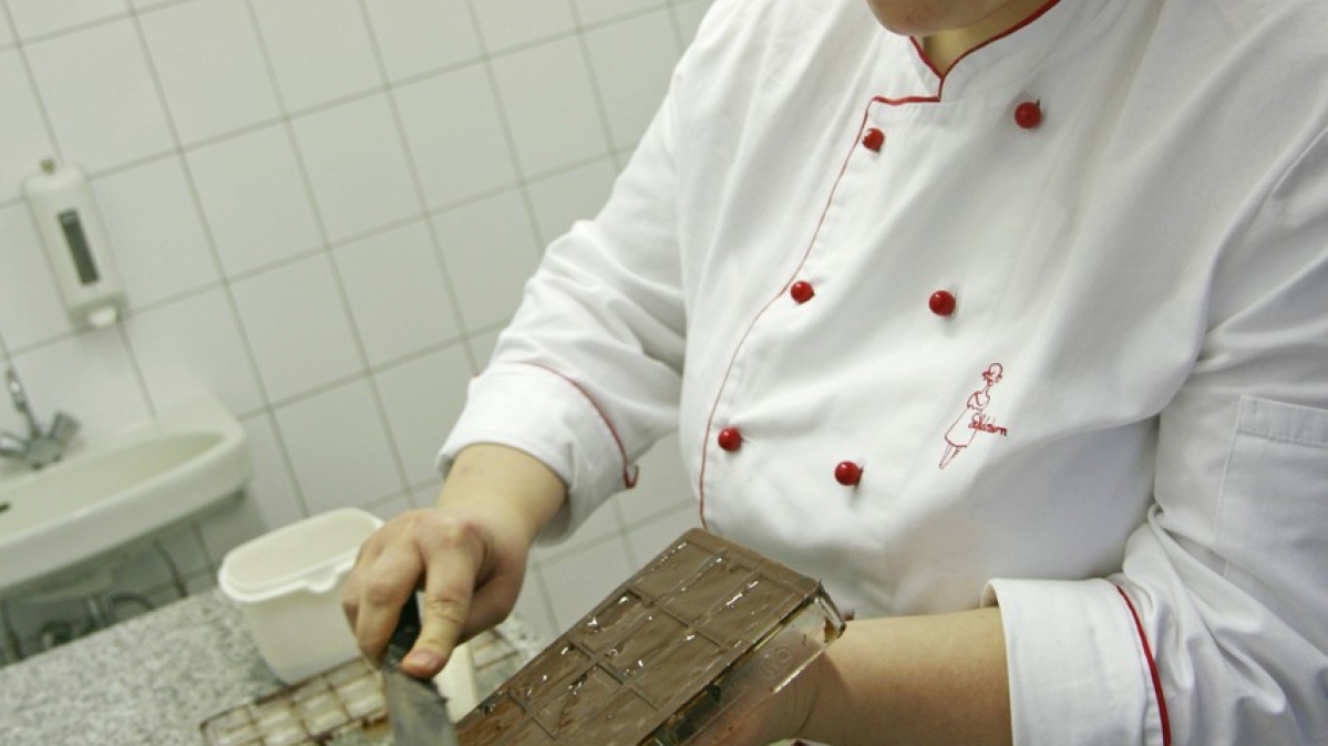 Zu den neuesten Kreationen gehört ein feiner Birnen-Sahne-Trüffel (ganz vorne links). Für die Canache – "eine Creme, die aus Schokolade und einer Flüssigkeit wie Sahne, Liköre oder Rotwein besteht" – kocht die Konditorin zunächst Sahne inklusive Vanilleschoten auf. Parallel dazu schlägt sie Butter auf. Wenn die Sahne kocht, wird sie in weiße Kuvertüre gegossen. Sobald die Canache erkaltet ist, kommt die aufgeschlagene Butter hinzu. Zuletzt verfeinert sie die Masse noch mit Birnenbrand und umhüllt am Ende das Ganze mit Schokoraspeln.