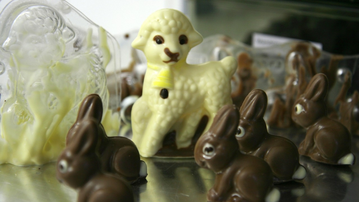 Bei der Schokodeern kündigt sich das Osterfest bereits an: ein Lamm aus weißer und viele Hasen aus dunkler Schokolade. Selbstverständlich per Hand koloriert.