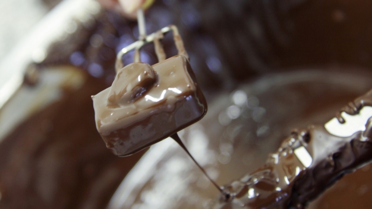 Umhüllt von köstlicher Kuvertüre, taucht die nun beinahe fertige Praline wieder auf.