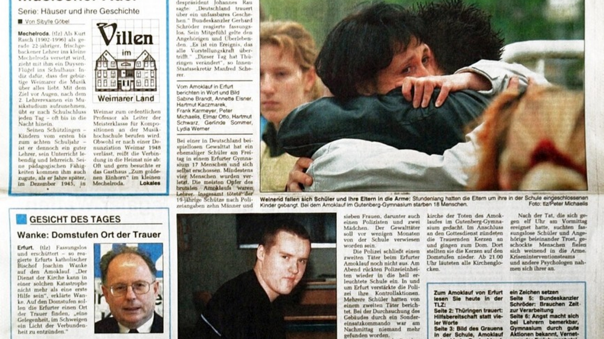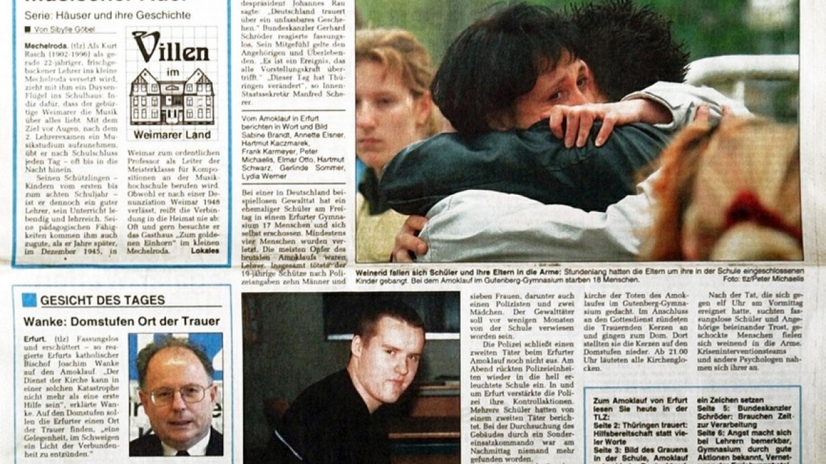 Ein ehemaliger Schüler richtet am 26. April 2002 im Gutenberg-Gymnasium in Erfurt ein entsetzliches Blutbad an. Er tötet bei seinem Amoklauf einen Polizisten, zwei Schüler und 13 Lehrer, ein Viertel des Kollegiums. Anschließend nimmt sich der 19-jährige Attentäter selbst das Leben. Der Amokläufer, der mit einer so genannten Pump-Gun bewaffnet ist, war zwei Monate vor dem Schulabschluss wegen der Fälschung von Attesten vom Gymnasium verwiesen worden. Waffen und Munition hat er sich als Mitglied eines Schützenvereins legal beschafft. Einen Tag später gedenken mit einem ökumenischen Gottesdienst im Erfurter Dom mehr als 2000 Menschen der Opfer des Amoklaufs. Die Bluttat löst eine bundesweite Debatte über Gewalt an den Schulen und die Zukunft des Bildungswesens aus. Am 11. März 2009 steht Deutschland erneut unter Schock: Beim Amoklauf eines 17-Jährigen in einer Realschule in Winnenden (Baden-Württemberg) werden 16 Menschen getötet, darunter der Täter. Nachdem der ehemalige Schüler in dem Gebäude neun Schüler und drei Lehrerinnen erschossen hat, flüchtet der Täter und bringt drei weitere Menschen um, bevor die Polizei ihn aufhalten kann.