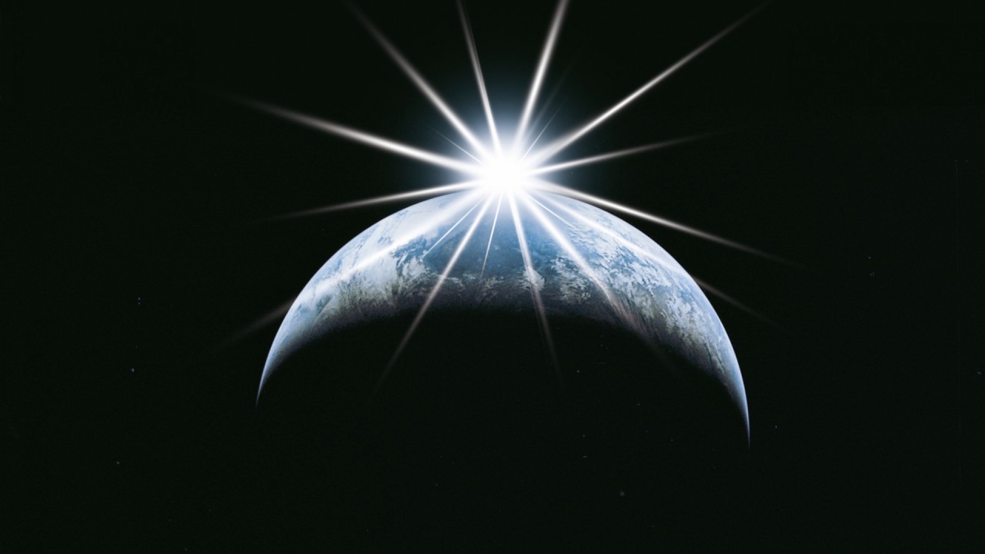 Eine Satellitenaufnahme zeigt die Sonne, die funkelnd hinter der Erde aufgeht.