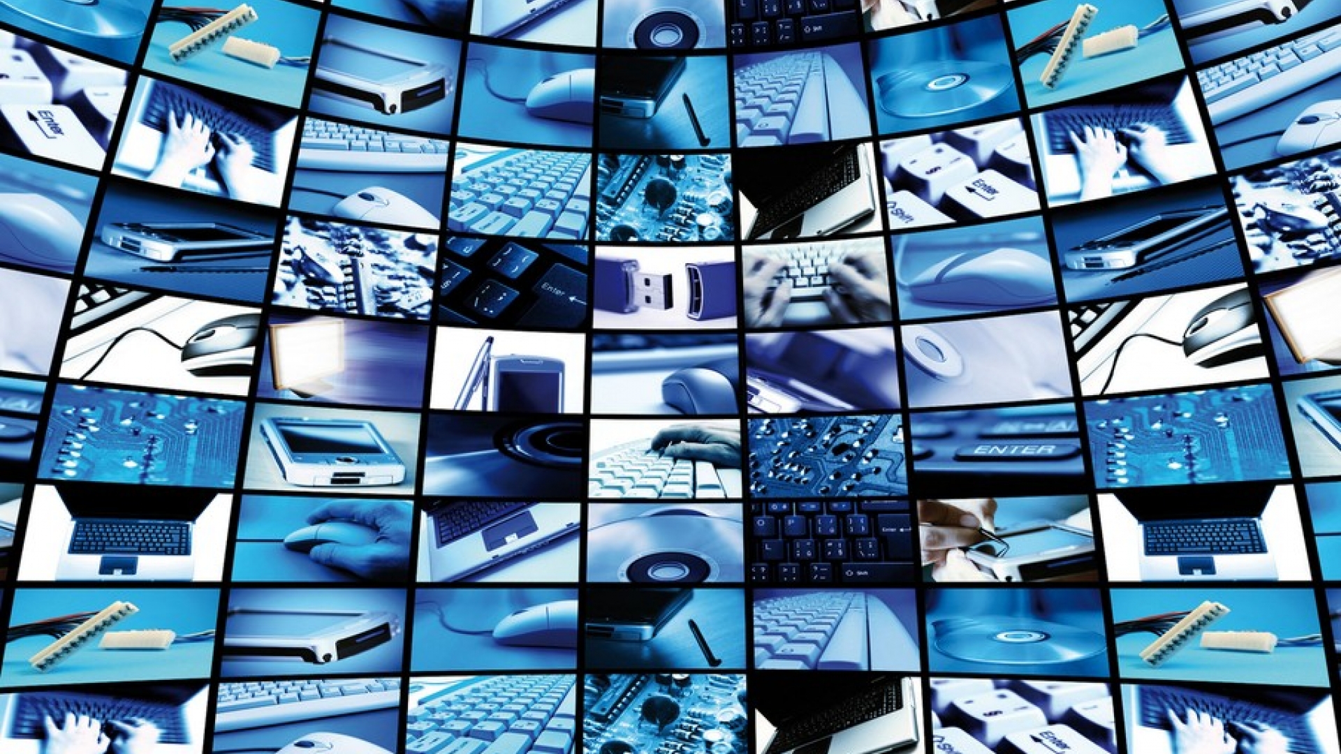 ... blüht der Bildschirm auf. Unzählige blaue Bilder auf Monitoren fügen sich wie ein Mosaik zu einem Gesamtbild.