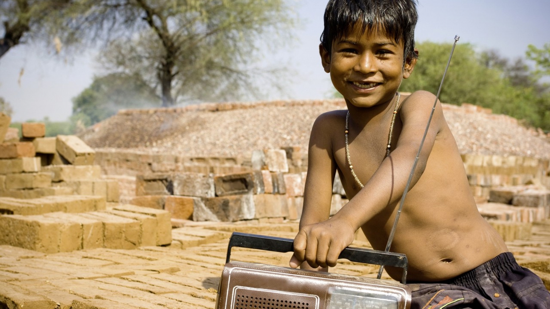 Hitze, Musik und Entspannung: Ein indischer Junge sitzt auf Ziegelsteinen in Maharashtra in Indien und hört Radio.