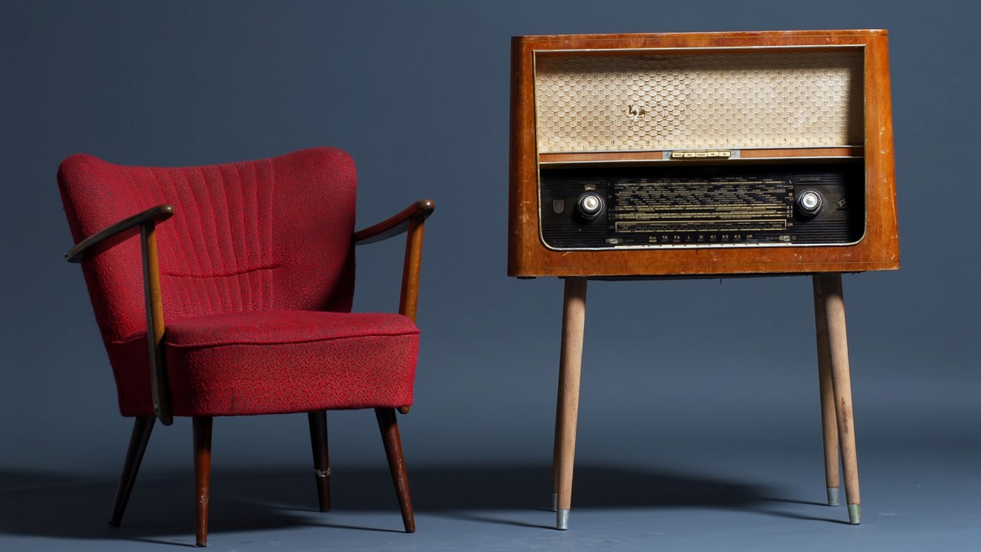 Unverkennbar der Stil aus den 1950er und 1960er Jahren. Nostalgisch wirken heute Armlehnsessel und Radio.