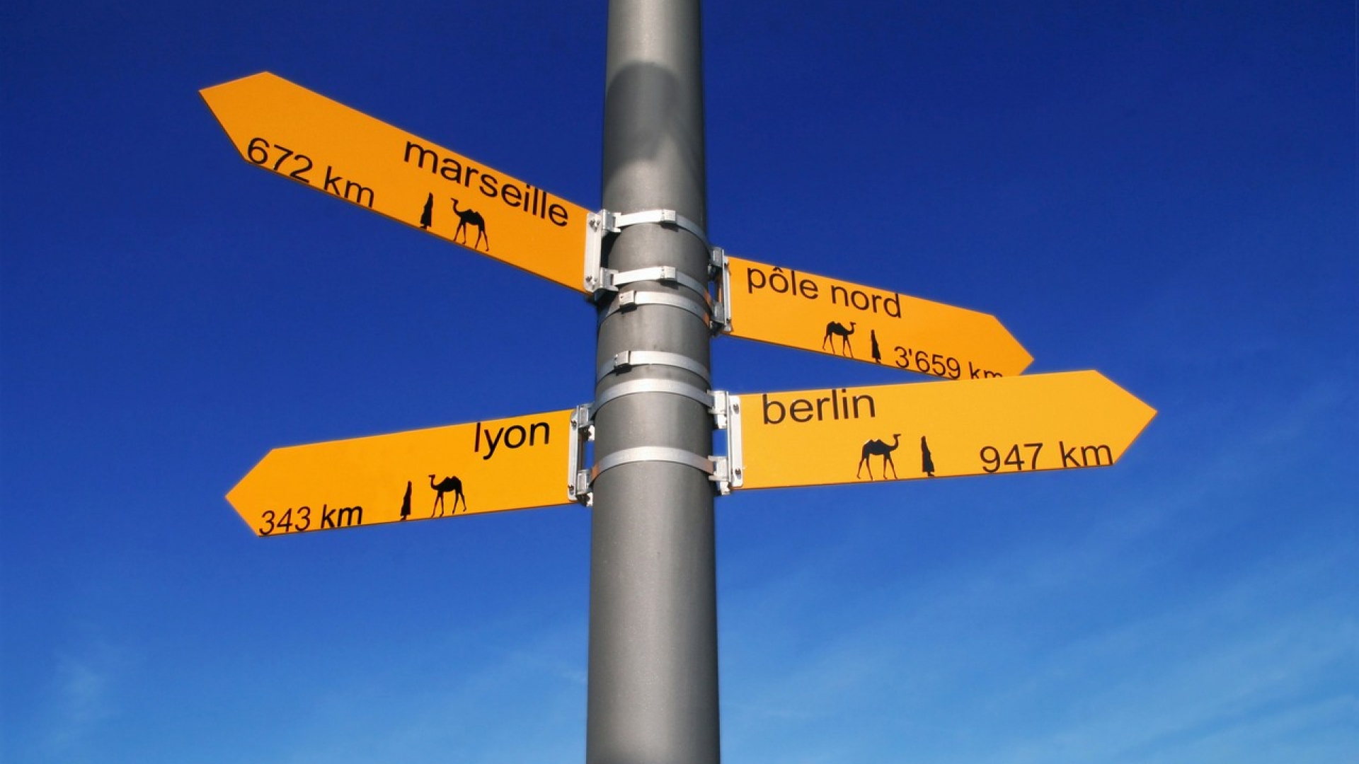 Eine Reise zum Nordpol gefällig? Oder doch lieber nach Lyon? Der in französischer Sprache gehaltene Wegweiser steht vermutlich in der Wüste, da Kamele als Symbol abgebildet sind.