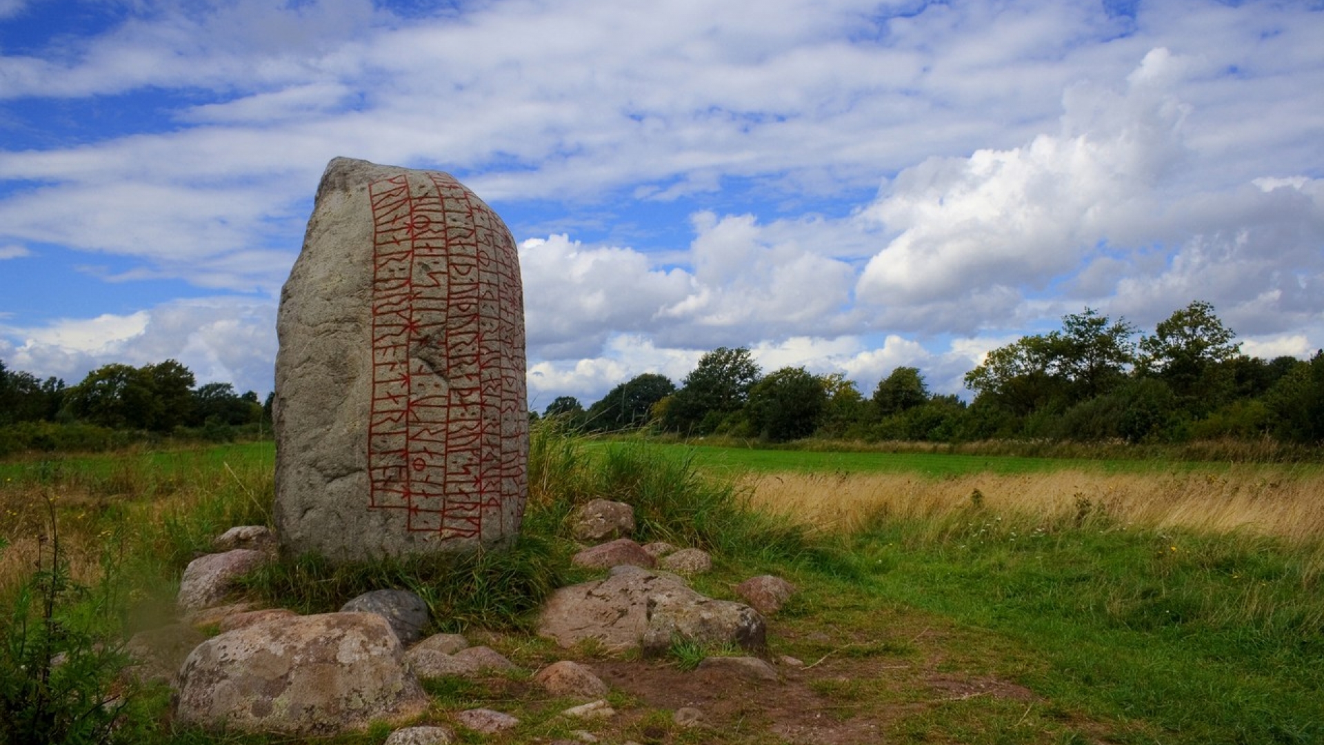 Das erinnert an Obelix und seine Hinkelsteine. Dieser Stein ist ein Karlevistein, ein Runenstein, und steht auf der Insel Öland in Schweden. In den Stein wurde vor rund 1000 Jahren ein Vers gemeißelt.