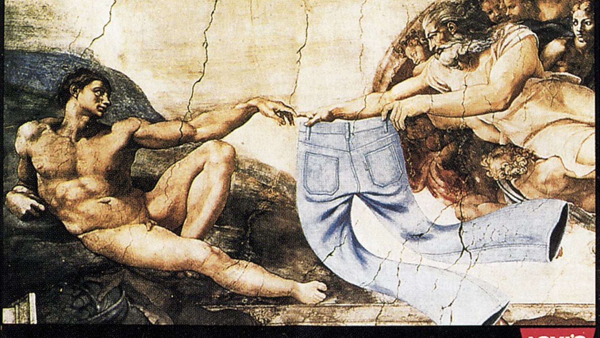 So etwas nennt man Vorsehung, oder? Da fällt dem nackten "Adam" doch glatt eine Hose vom Himmel. Levi's warb 1973 mit dem verfremdeten Michelangelo-Gemälde für seine Bluejeans.