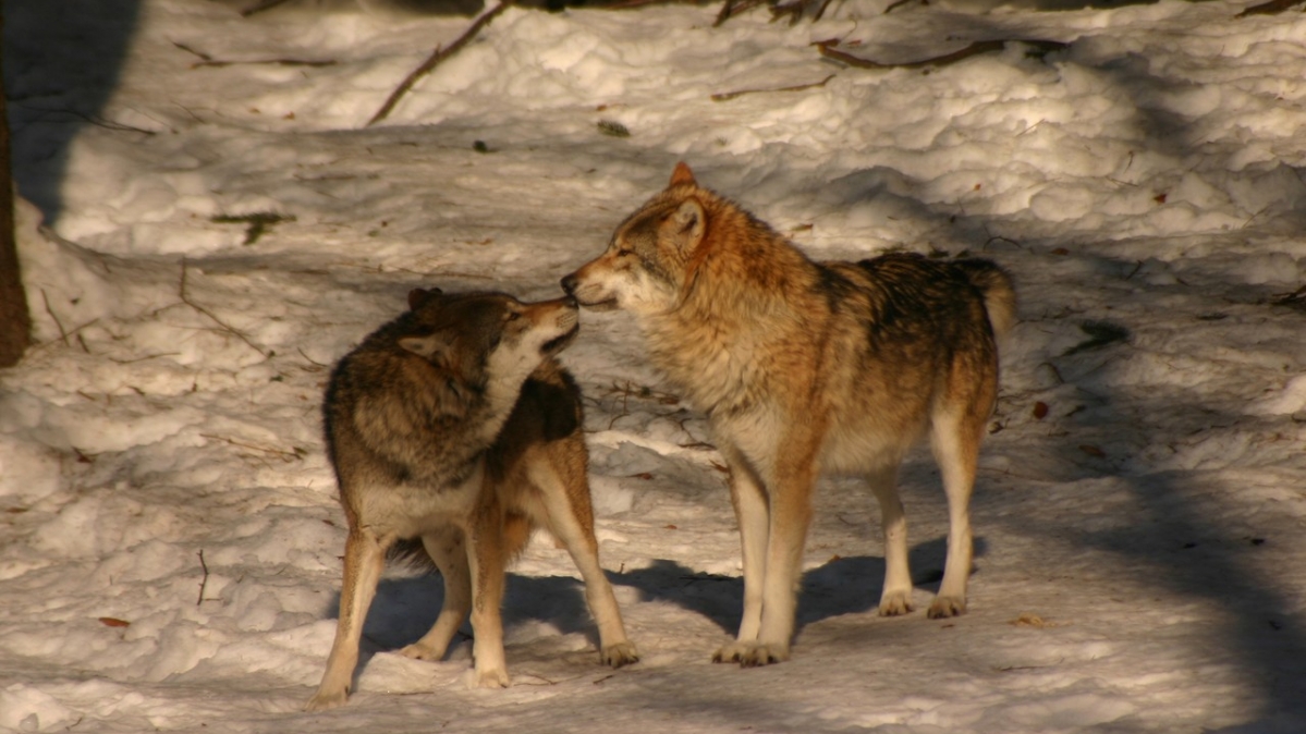 Zwei Wölfe beschnüffeln sich im Schnee.