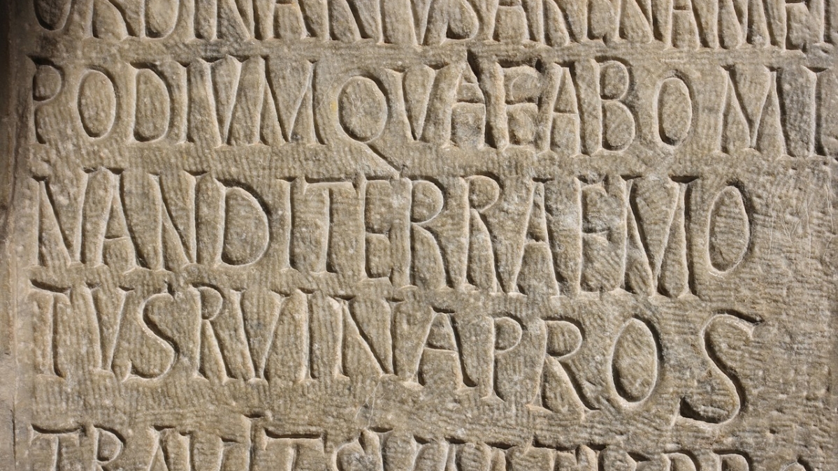 Eine lateinische Inschrift in Form der "Scriptio Continua" im römischen Kolosseum. Wörter und Buchstaben sind ohne Leerzeichen aneinandergereiht.