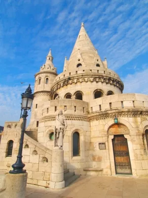 Am östlichen Ende des Burgbezirks, hinter der Matthiaskirche am Steilhang zur Donau, befindet sich das Wahrzeichen der Stadt, jenes Bauwerk, zu dem die meisten Budapest-Besucher strömen: die um die Jahrhundertwende in neoromanischem Stil errichtete Fischerbastei. Auf den ersten Blick meint man eine Wehranlage zu erklimmen, aber oben angelangt, zeigt sie sich als gewaltig große Aussichtsterrasse aus weißem Sandstein, geradezu ideal, um an heiteren Tagen die Sonne über Budapest zu genießen. Von hier aus hat man den schönsten Blick auf das Parlament, die Kettenbrücke (1839-1849 als erste steinerne Donaubrücke Budapests errichtet), den Donaukorso und die Innerstädtische Pfarrkirche. Der Name Fischerbastei rührt von den Fischern her, die während der Türkenkriege die einst vorhandene Stadtmauer an dieser Stelle zu verteidigen hatten.