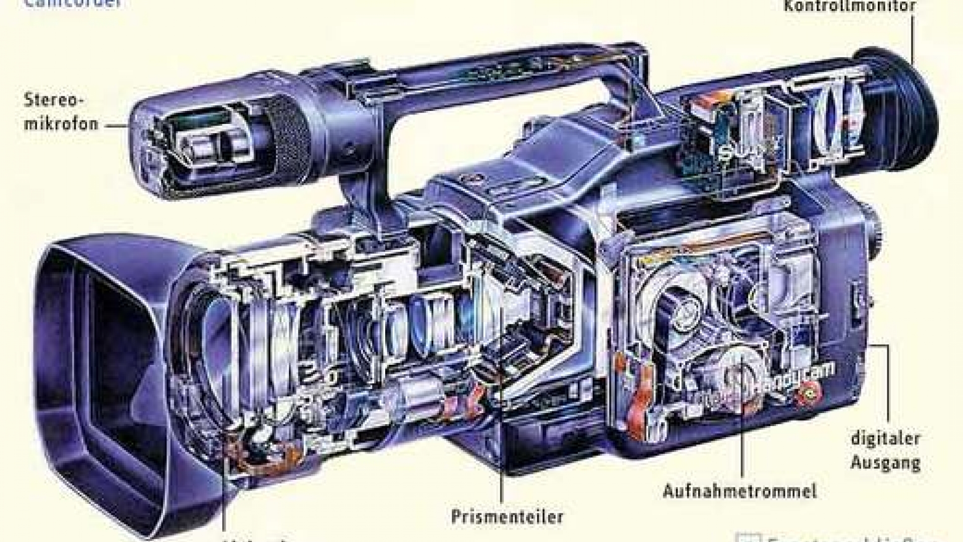 Die heutigen Camcorder können, im Gegensatz zu den Fernsehkameras von früher, bei nahezu Kerzenlicht detailgetreue Bilder aufzeichnen und vereinen Elemente eines kleinen Filmstudios. Das einfallende Licht wird in elektromagnetische Wellen umgewandelt, die von kleinen Bandköpfen als Muster winziger Magnetpartikel auf Band gespeichert werden. Zu den wichtigsten Bestandteilen gehören ein Stereomikrofon, ein Objektiv, ein CCD-Bildwandler und ein Präzisionslaufwerk mit den Magnetköpfen.