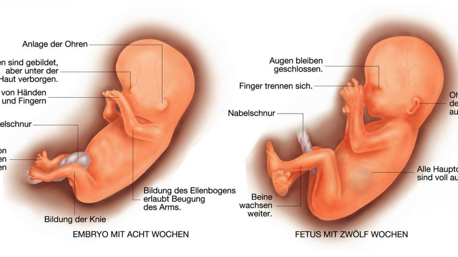 Das erste Trimenon bezeichnet das erste Drittel der Schwangerschaft. Sie dauert etwa 40 Tage. Aus der Zygote, der befruchteten Eizelle, entsteht in dieser Zeit der Embryo. So wird das heranwachsende Kind in den ersten zwölf Wochen genannt, bevor es sich zum Fetus weiterentwickelt. Während dieser Zeit werden alle Organe und Körpersysteme angelegt. Sie ist deshalb die empfindlichste Periode der Schwangerschaft. In den ersten vier Wochen entwickelt sich aus dem Trophoblast die Plazenta, die den Embryo ernährt. Der innere Zellverband entwickelt sich zur Keimscheibe. In der fünften Woche bilden sich daraus drei Zellschichten, aus denen alle Körperorgane hervorgehen: Ektoderm, aus dem sich die Haut und das Nervensystem entwickeln, Mesoderm, das zu Muskeln, Herz und Geschlechtsorganen wird, und Endoderm, aus dem die inneren Bauchorgane entstehen. Nach der zwölften Woche ist der Fetus 9 cm lang und wiegt 30g, sein Herz schlägt schon.