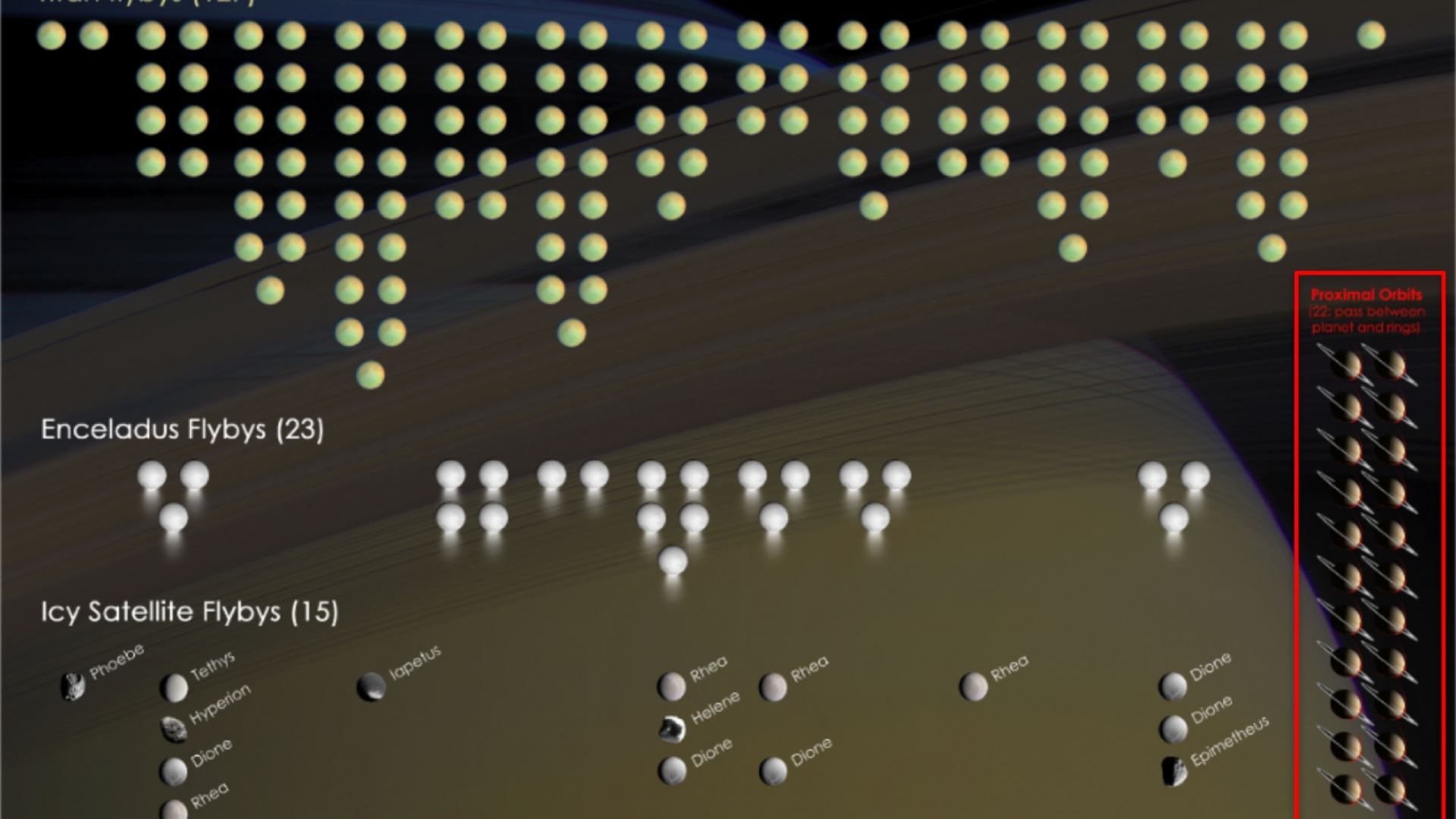 Am 1. Juli 2004 – nach siebenjähriger Reise – kam Cassini endlich an ihrem fernen Ziel an. Die Raumsonde schwenkte in einen Orbit um den Saturn ein. Im Laufe der letzten 13 Jahre kreiste Cassini im Saturnsystem und flog dabei auch immer wieder nah an dessen Monden Titan und Enceladus, aber auch an kleineren Saturntrabanten vorbei. Bei einem der Vorbeiflüge setzte Cassini die europäische Landesonde Huygens auf dem Titan aus. Diese lieferte als erste Bilder und Daten von der Oberfläche dieses Mondes – denn ein dichter orangefarbener Wolkenschleier verhüllt seine Oberfläche.