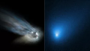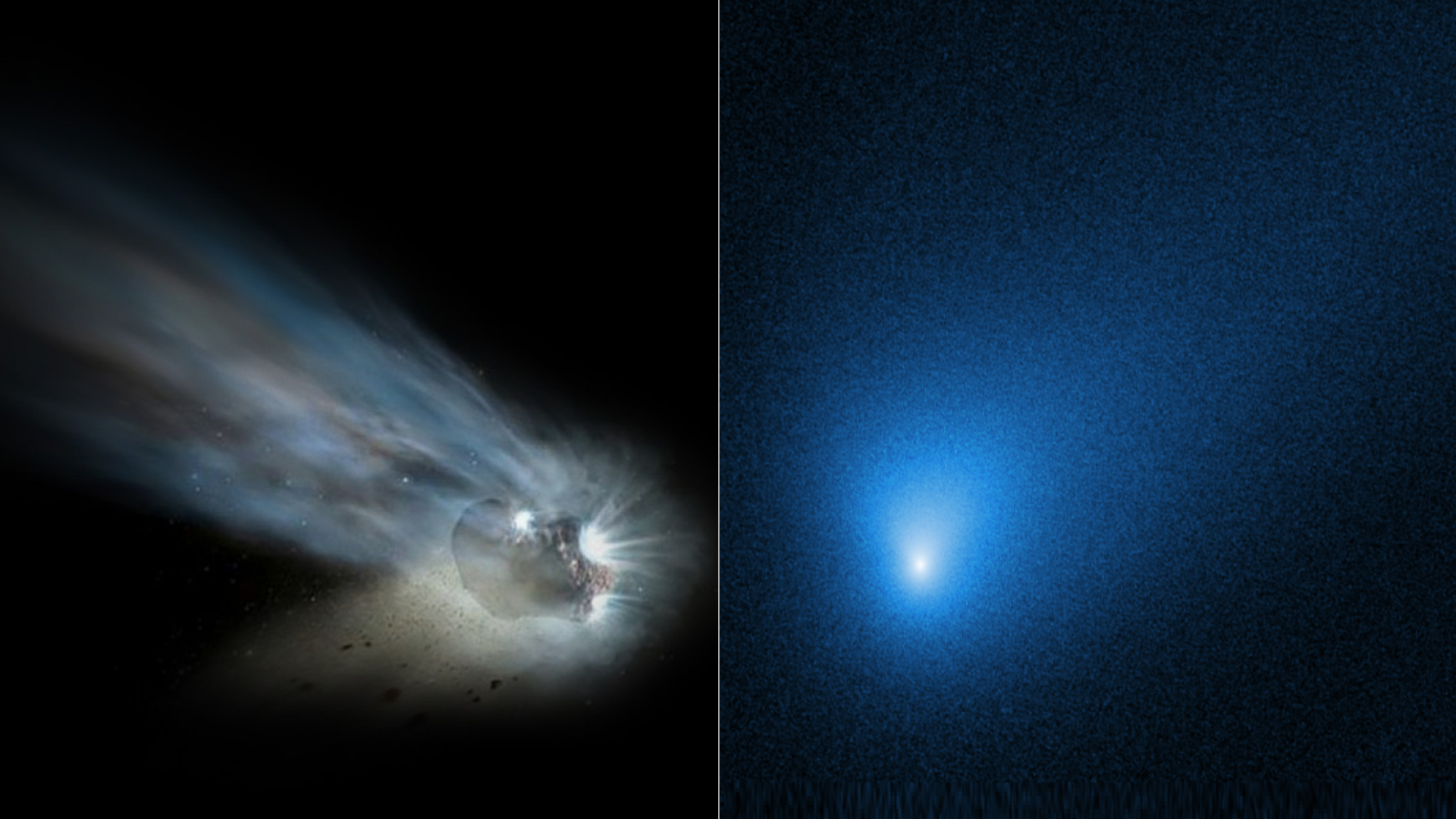 Ähnlich wie manche unserer heimischen Kometen überstand auch 2l/Borisov den nahen Vorbeiflug an der Sonne nicht unbeschadet: Im März 2020 brach ein Stück seines eisigen Kerns ab, wie Aufnahmen des Hubble-Weltraumteleskops enthüllten. Weil Kometenkerne vorwiegend aus Eis bestehen, verdampft die Sonnenwärme einen Teil ihres Materials. Dies kann große Löcher in den Kometenkern reißen oder auch Stücke von ihm absprengen.