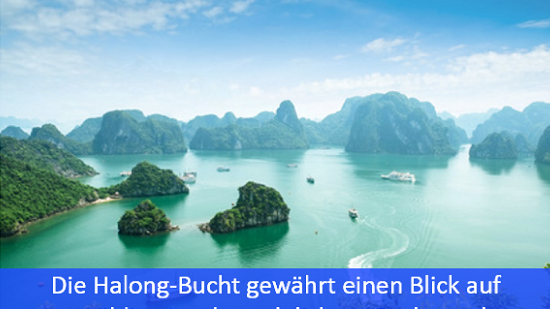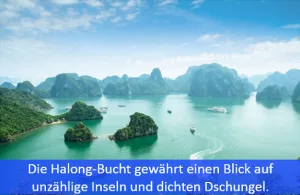 Die Halong-Bucht befindet sich im Norden Vietnams und umfasst etwa 1.500 km². Laut offizieller Angaben besteht die Halong-Bucht aus insgesamt 1969 Kalkfelsen, bei denen es sich vor allem um Felsen und unbewohnte Inseln handelt. Teilweise ragen diese einige hundert Meter aus dem Wasser heraus. Zum Weltnaturerbe wurde die Bucht von der UNESCO im Jahr 1994 erklärt. Der Legende nach entstand die Bucht durch einen Drachen, der in den Bergen nahe am Meer lebte. Während er zur Küste lief, zog er tiefe Furchen in das Land, welches daraufhin überflutet wurde, als der Drache im Wasser verschwand. Tatsächlich ist die Bucht durch einen im Holozän ertrunkenen Kegelkarst entstanden. Einige Strände wie auch viele der Grotten und Höhlen können nur erreicht werden, wenn Ebbe herrscht. Die einzelnen Inseln sind meist dicht bewachsen, teilweise existieren auf ihnen dichte Dschungel. In den Grotten können hingegen Stalagmiten und Stalaktiten entdeckt werden.