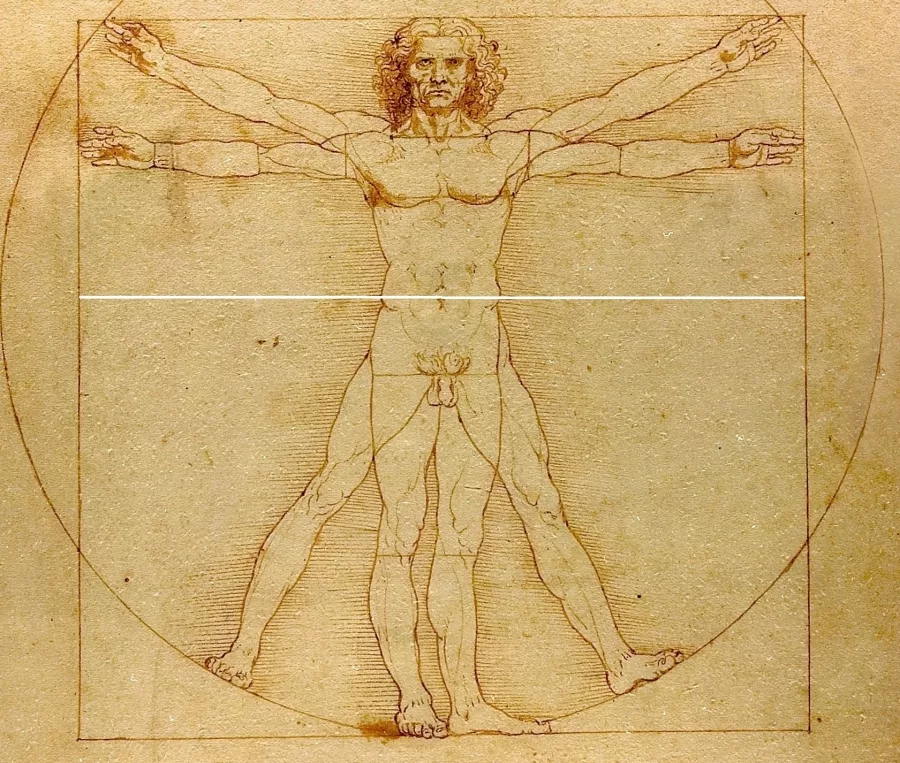 Ein bekanntes Beispiel für den goldenen Schnitt in unseren Proportionen ist Da Vincis sogenannter vitruvianischer Mensch, der mit ausgestreckten Armen und Beinen entweder in ein Quadrat oder einen Kreis passt. Hier lassen sich die göttlichen Proportionen überall wiederfinden, sowohl im dargestellten Menschen selber, als auch in dem Verhältnis von Kreis und Quadrat.